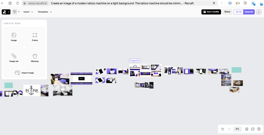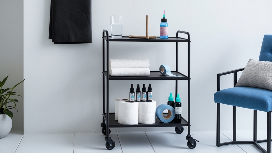 Пример промпта: «imagine a tattoo artist’s workplace, minimalistic and clean, against a snow-white wall. A trolley in a black metal frame with two shelves. On the top shelf there is a black disposable napkin, a stack of white paper towels, a clear glass of water, a small bottle with a pink nozzle filled with blue liquid. On the bottom shelf is a roll of paper towels, a box of gloves, a box of glove material, a roll of duct tape, a small jar of yellow cream, several black bottles of tattoo ink, a pair of blue scissors, a roll of blue transfer paper. The photo is gentle, cozy. There is a blue upholstered chair next to the cart. Photorealistic, clean studio lighting, clear focus.»
