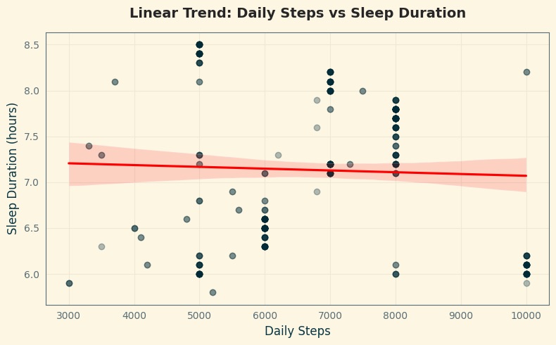 Вторая гипотеза была направлена на выявление зависимости между физической активностью и продолжительностью сна. Визуализация включала два графика регрессии. Первый из них показывает точки распределения по количеству шагов и продолжительности сна, сгруппированные по полу. Второй график содержит ту же выборку, но дополнен линией тренда, которая подчёркивает, что статистическая связь между этими переменными крайне слабая. Это подтверждается коэффициентом корреляции, равным -0.04.