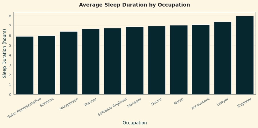 Результаты анализа подтверждают, что на продолжительность и качество сна влияют несколько факторов, среди которых профессия и уровень стресса, однако факторы физической активности и пола значительного влияния не показали. Таким образом, это исследование показывает, что сон — это многогранный процесс, зависящий от сочетания физиологических, поведенческих и социальных факторов. Визуальный подход к исследованию позволил не только выявить ключевые зависимости, но и представить их в удобной форме для интерпретации.