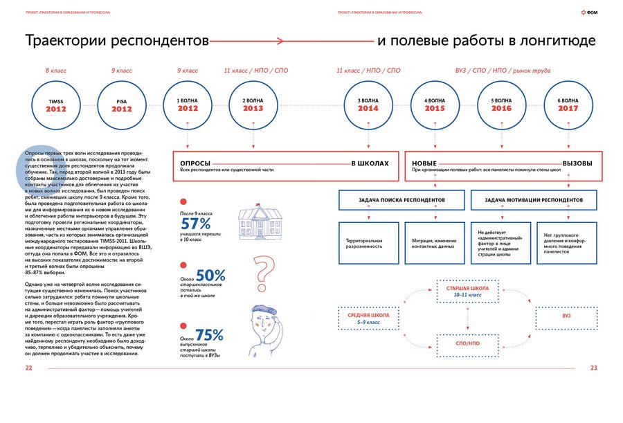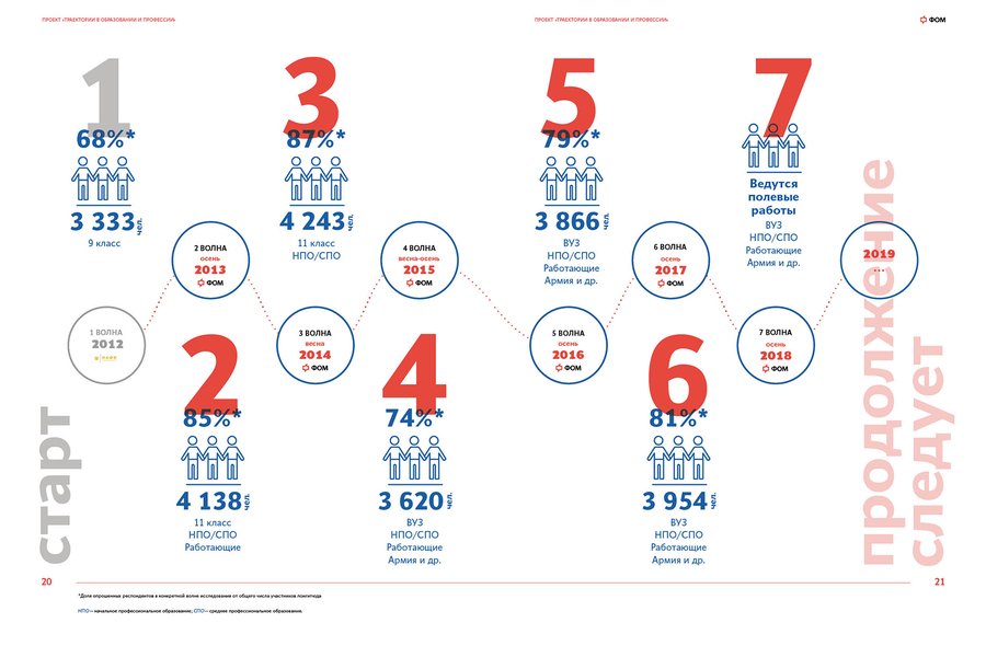 Проект «Траектории в образовании и профессии» инициирован в 2012 году в НИУ ВШЭ. С 2013 года основным партнером университета в сборе информации по проекту является Фонд «Общественное мнение» (ФОМ). Координаторы, аналитики и полевые интервьюеры ФОМа в сотрудничестве с коллегами из НИУ ВШЭ успешно поддерживают крупнейшую в России национальную панель для лонгитюда.