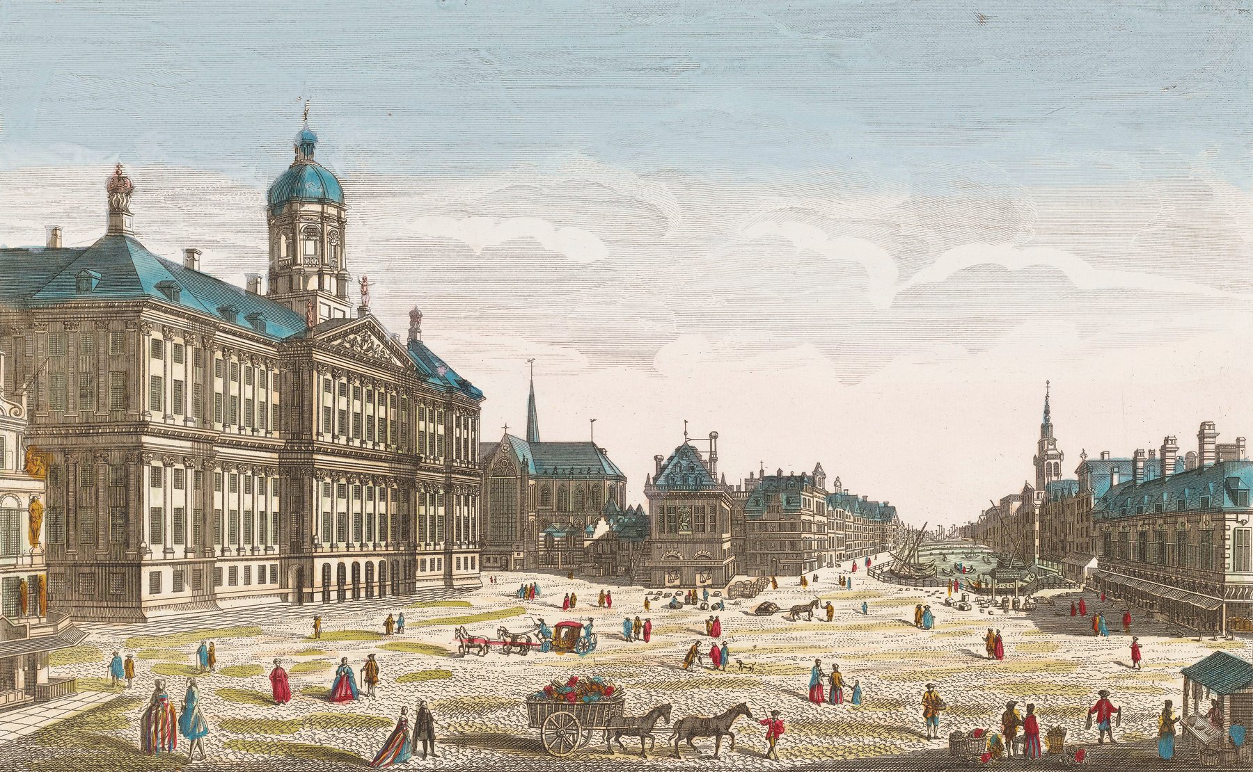 Строительство новой ратуши «на плотине» началось в 1648 году и завершилось в 1655. Хотя голландская архитектура того времени тяготела к простоте, архитектор Якоб ван Кампен подошел к работе с фантазией, применив элементы палладианства и итальянского стиля: треугольный фронтон заполнен скульптурами, традиционная ратушная башня оформлена в виде овальной в плане ротонды и т. д. После того, как пала власть Оранского дома, королем Нидерландов под именем Людовика Голландского стал брат Наполеона Люсьен. Он переехал в Амстердам и превратил ратушу в королевский дворец. Его залы и галереи были украшены картинами голландских художников. Ныне монархи используют дворец как для приемов иностранных делегаций, так и для других мероприятий — например, вручений премий Эразма.