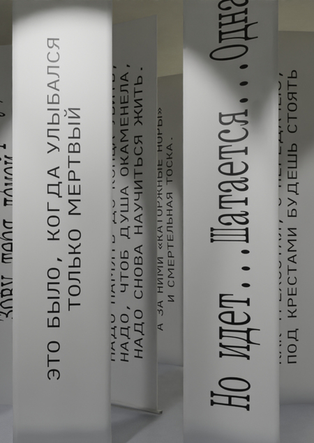 Данная инсталляция — авторское проживание текста поэмы «Реквием» Анны Ахматовой. Инсталляция состоит из объектов, которые с помощью акцидентной типографики погружают зрителя в особенное состояние для восприятия и проживания новых смыслов поэмы Реквием. Главным инструментом отражения авторской идеи становится язык типографики.