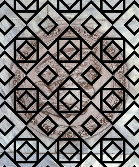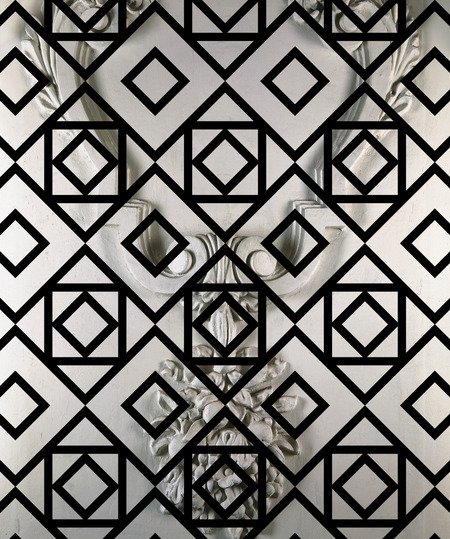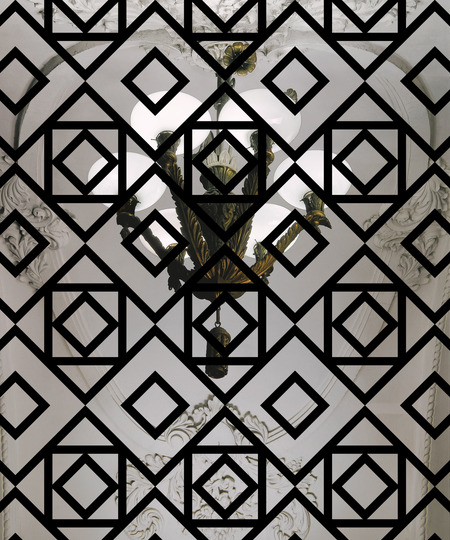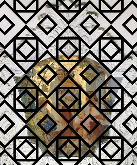Слева: Люстра на своде центрального зала. Бронза, стекло. Справа: Картуш на пилоне центрального зала.
