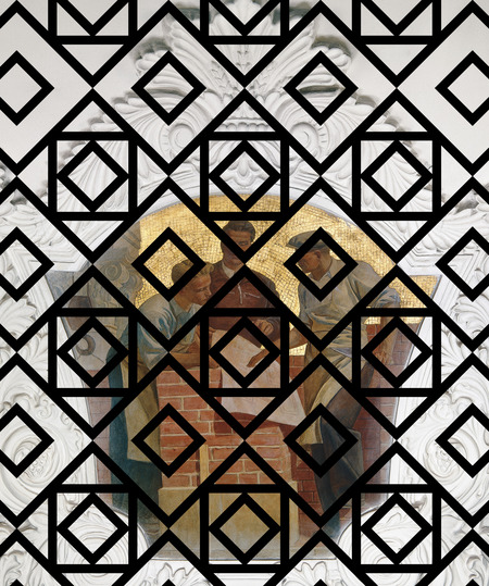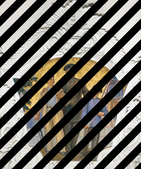 В. А. Коновалов, В. Н. Аракелов, П. М. Михайлов, Л. А. Карнаухов, А. К. Ширяева, И. В. Радоман, К. П. Аксенов. Панно «Трудящиеся советской Украины»: «Архитекторы», «Физкультурники». Темпера, золото