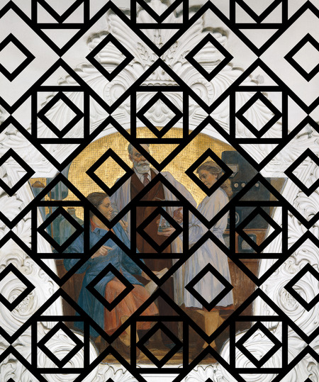 В. А. Коновалов, В. Н. Аракелов, П. М. Михайлов, Л. А. Карнаухов, А. К. Ширяева, И. В. Радоман, К. П. Аксенов. Панно «Трудящиеся советской Украины»: «Ученые-химики», «В детском саду». Темпера, золото