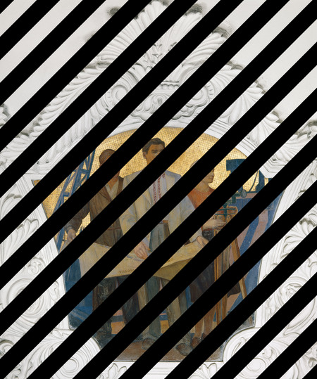 В. А. Коновалов, В. Н. Аракелов, П. М. Михайлов, Л. А. Карнаухов, А. К. Ширяева, И. В. Радоман, К. П. Аксенов. Панно «Трудящиеся советской Украины»: «Машиностроители», «Трудовая смена». Темпера, золото
