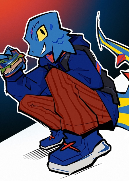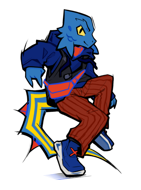 Рикко — синий бурге-ящер, дерзкий по натуре, но в душе он фанат ламповых тусовок на крышах и запаха свежеиспечённой булочки. Стрит-арт это его язык выражения, без него ему никак.