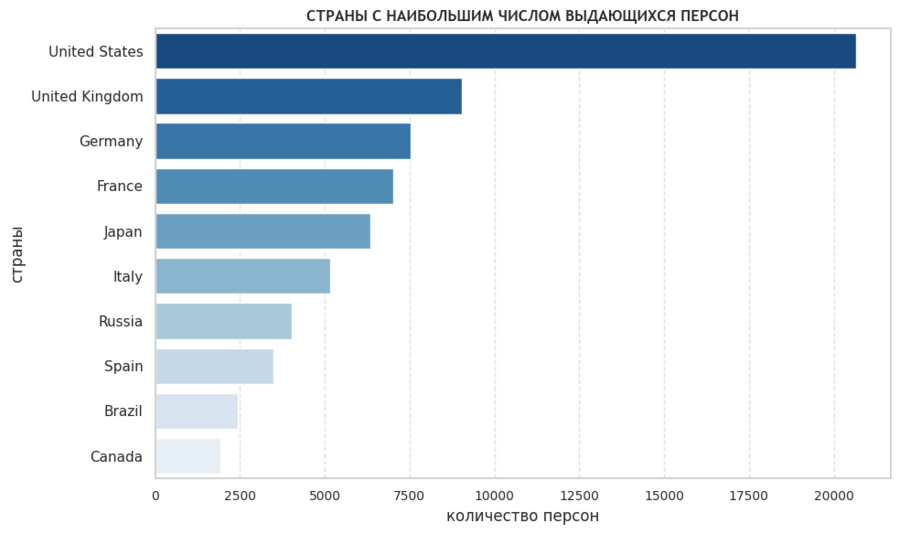 Горизонтальный столбчатый график показывает топ-10 стран по числу известных персон. Это даёт общее представление о геополитической картине исторической памяти.