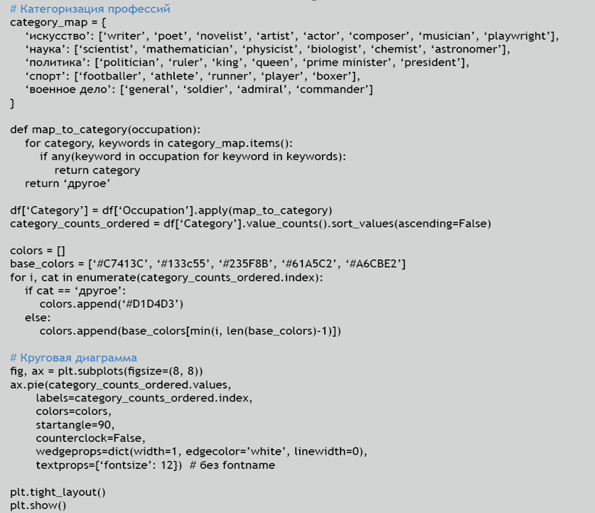 Профессии были очищены и разделены, так как у одного человека может быть несколько. С помощью Counter я построила частотный словарь и визуализировала его в виде облака слов. Размер шрифта отражает частоту упоминания. Это помогло быстро определить доминирующие типы карьер.