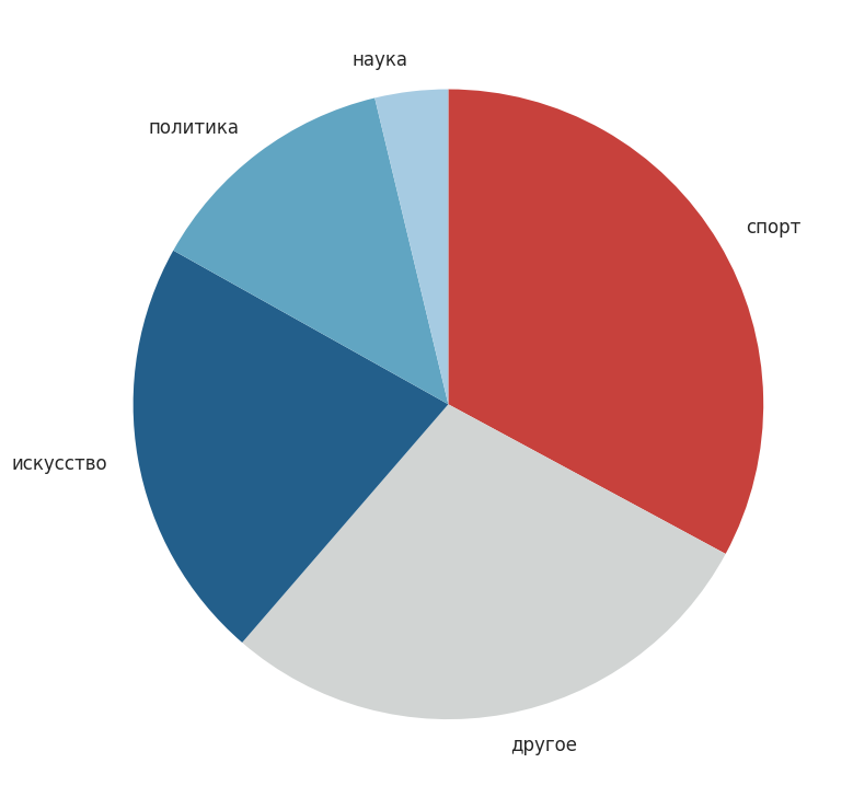 Круговая диаграмма делит всех персонажей по крупным сферам деятельности: искусство, политика, наука, спорт и другое. Так можно понять, какие области чаще всего приводят к «известности».