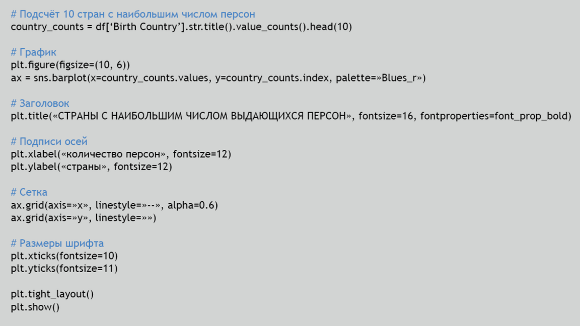 Сначала я проанализировала географическое распределение персон. Сгруппировала данные по странам рождения, отсортировала по количеству и выделила 10 стран с наибольшим числом известных людей. Это дало общее представление о «географии исторической значимости».