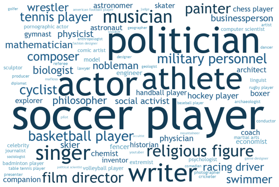 Я вручную классифицировала профессии на 5 обобщённых сфер: спорт, искусство, наука, политика, другое. Это позволило увидеть, какие сферы общественной жизни формируют историческую известность в массовом сознании.