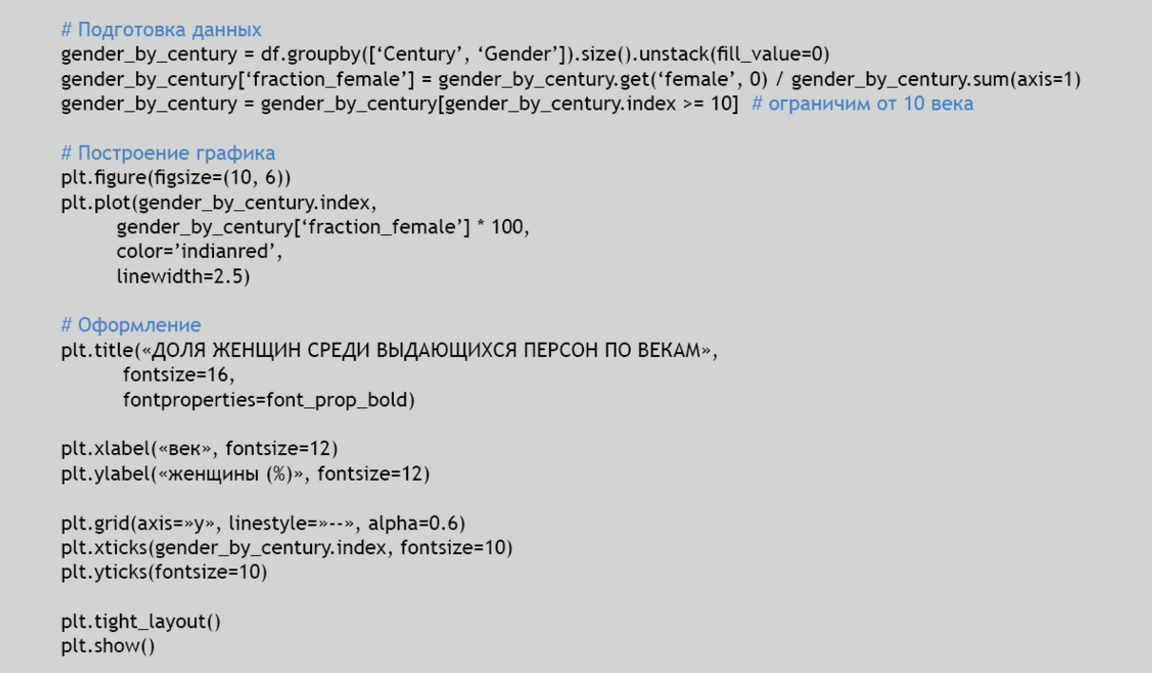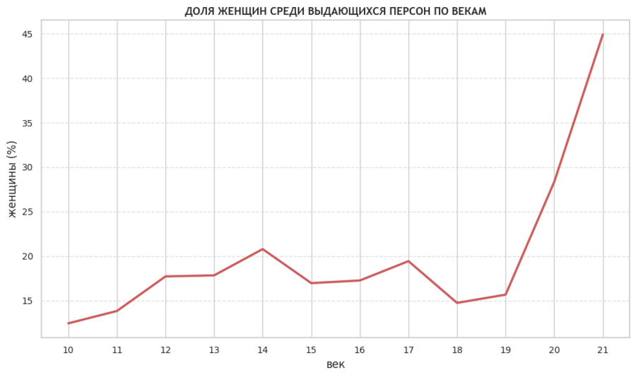 Далее я перешла к анализу гендерного представительства. Преобразовала год рождения в век и рассчитала процент женщин среди всех персон в каждом веке. Линейный график наглядно показывает рост видимости женщин в истории, особенно начиная с XX века.