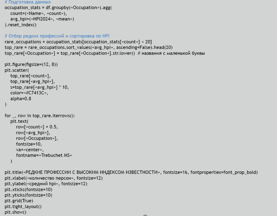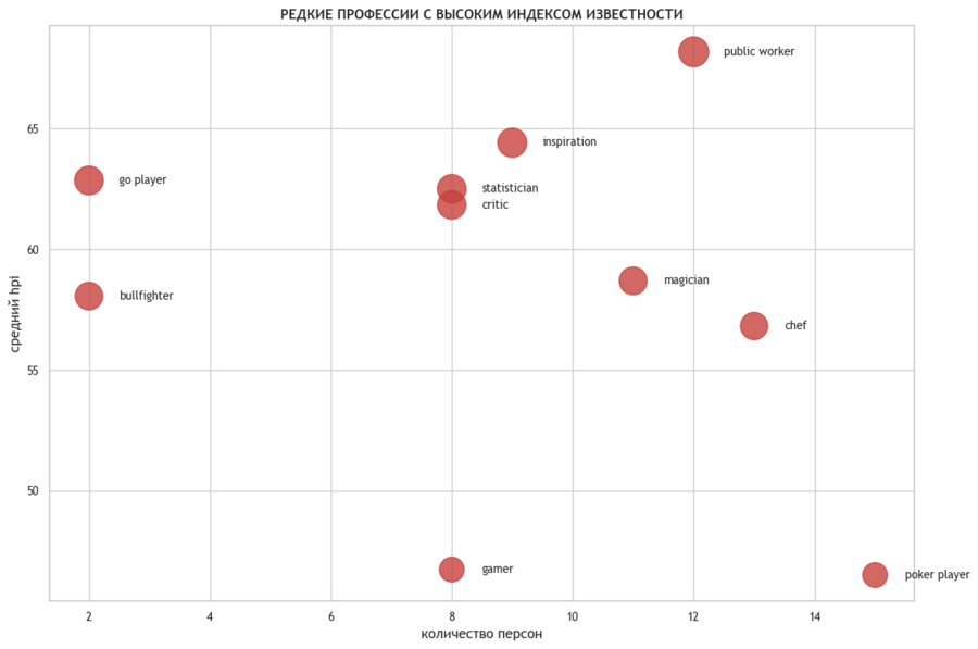 Для более содержательного анализа я выделила редкие профессии (менее 20 человек), но обладающие высоким средним HPI. Индекс HPI (Historical Popularity Index) отражает устойчивость и глобальность культурного влияния личности: он учитывает количество языков, в которых существует статья о человеке, объём просмотров, географическую распространённость и длительность интереса. Построенная пузырьковая диаграмма показывает, как количественно малые, но значимые профессии оказываются носителями непропорционально сильного исторического следа.