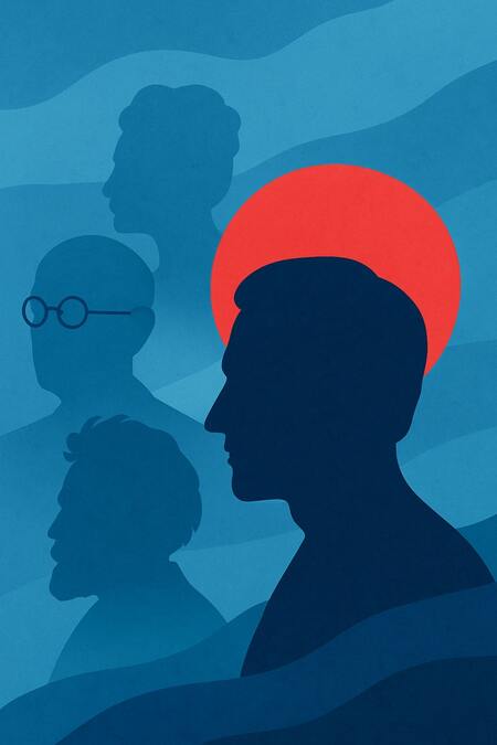 Промт для обложки: «Silhouettes of famous historical male figures in profile, layered in soft monochrome blue shades, with one figure in the foreground highlighted by a bright red circular halo behind the head. Flat minimalist vector style, textured background, subtle waves in the backdrop, modern editorial illustration, symbolic composition about fame and memory.»
