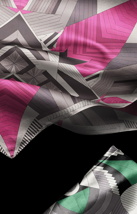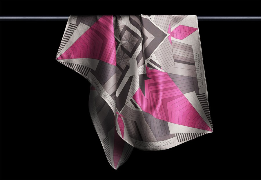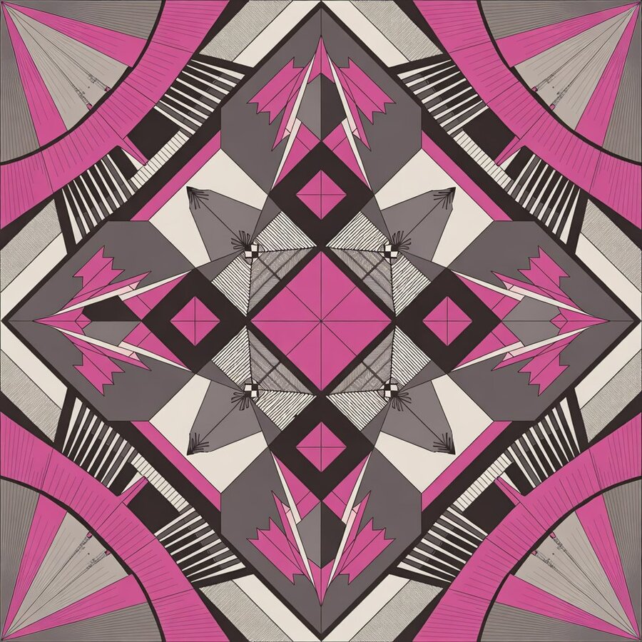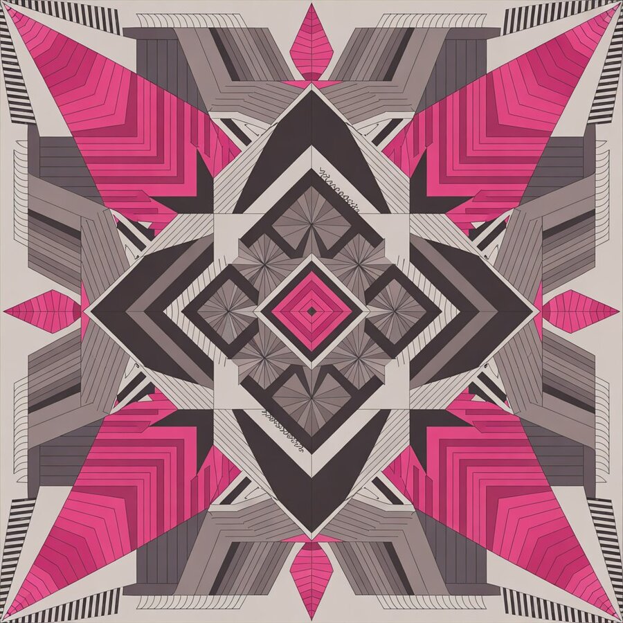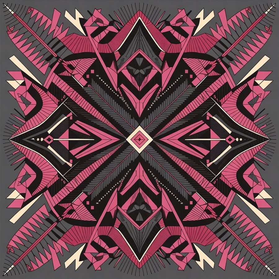 A richly detailed, ornamental print for a 25×25 cm scarf, blending the rational structure of Constructivist art with the delicate, symbolic rhythms of Scandinavian folk ornamentation. Dense composition of geometric elements — triangles, diamonds, arrows, and circles — layered with optical precision and harmonious flow. Use a color scheme of dark gray, vivid electric magenta for contrast, and sail white as a neutral grounding tone. The final look should evoke both mathematical clarity and handcrafted charm.