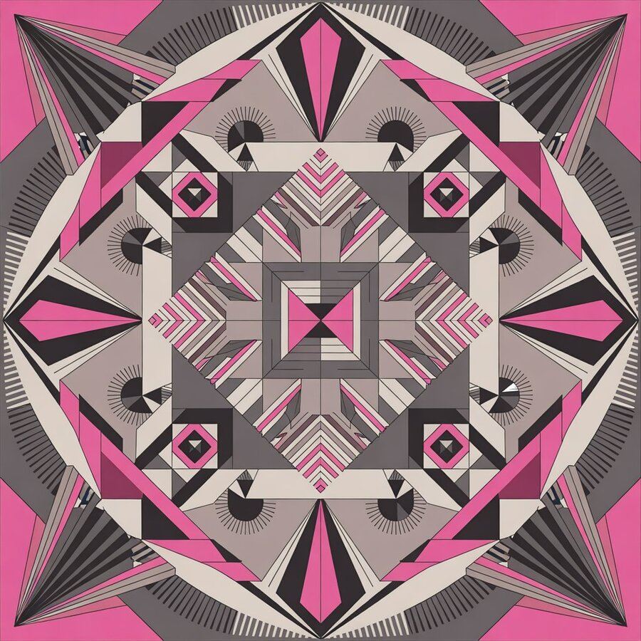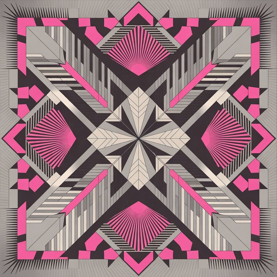 Design a square ornamental print for a 25×25 cm scarf that merges the rigorous formalism of Constructivist design with the refined repetition of Scandinavian folk ornamentation. Imagine a composition of mechanical precision, constructed with layered concentric patterns, modular repetitions, and radiating lines, but softened through references to nature-inspired Nordic motifs like stylized snowflakes, runic patterns, and woven grids. The layout should be highly organized yet intricate, almost meditative in complexity — a labyrinth of angular symmetry and radial balance, with areas of visual density and breathing space. Use dark gray as the base, enrich forms with sail white (a soft, warm off-white) to create contrast and layering, and inject electric magenta sparingly — as glowing visual accents, almost like neon embroidery — to add vibrancy and surreal contrast. Think of it as a synthesis of Bauhaus poster aesthetics, mandala logic, and folk textile rhythm — both technical and poetic. Use vector-like clarity, clean edges, no shading or 3D effects, just bold, graphic composition with high visual impact.