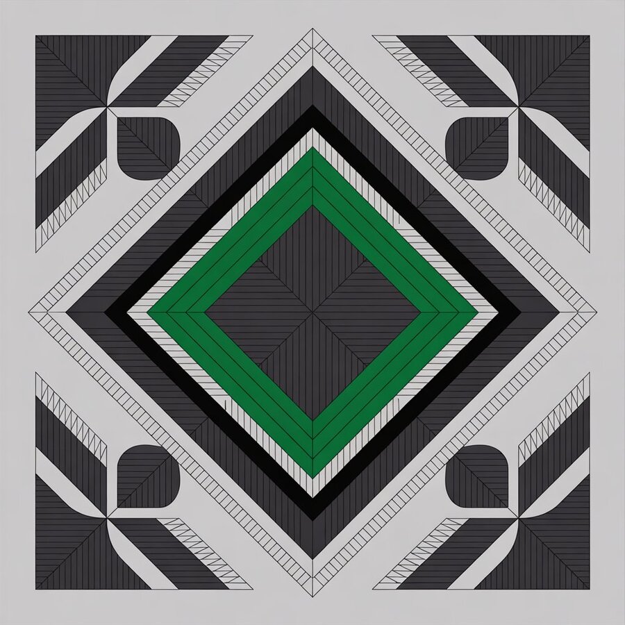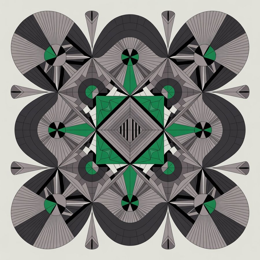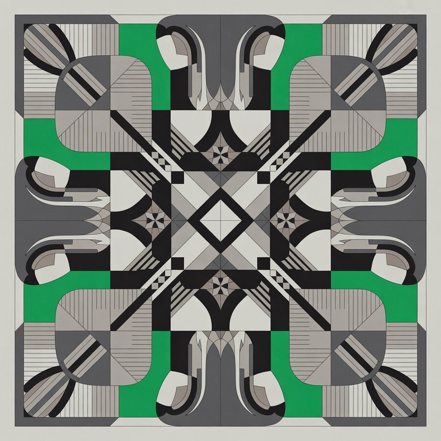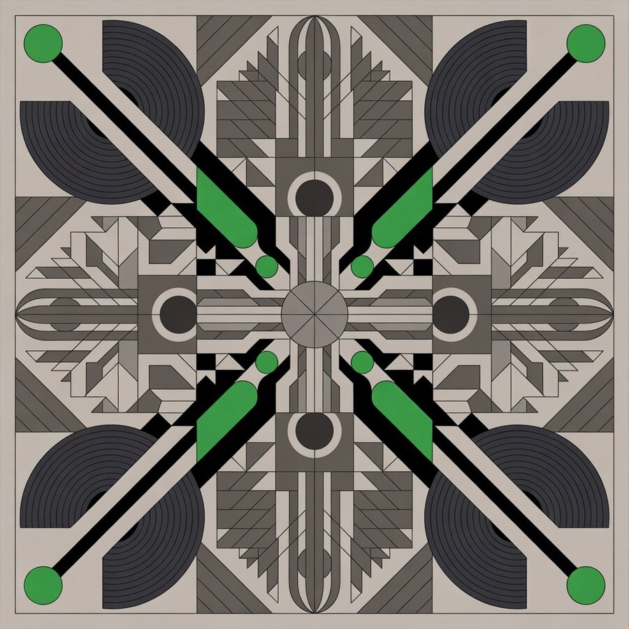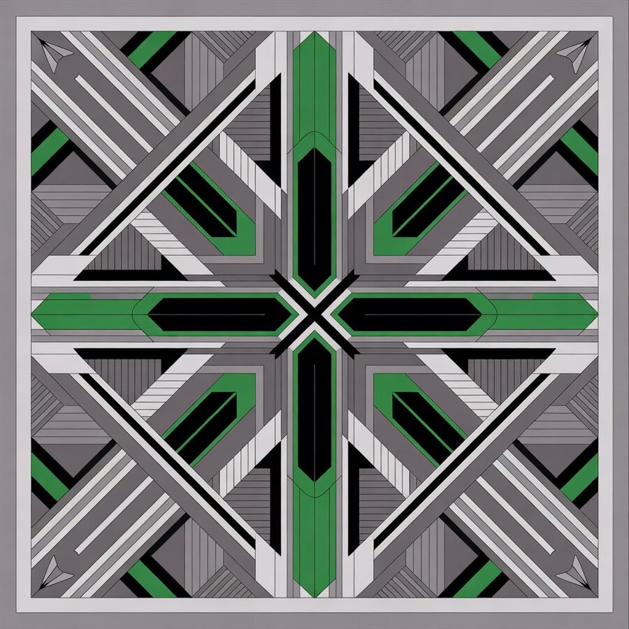 Create a powerful and intricate ornamental print for a 25×25 cm silk scarf. The design must blend the strict geometry and visual logic of Constructivism with the cyclical rhythm and runic repetition of Scandinavian ornamentation. Beneath the clean structure, let there pulse a primordial force — something ancient and wild, like the echo of ritual drums carved in stone. Integrate subtle references to archaic symbols: abstracted beasts, fractured totems, sharp fang-like forms, and vortex spirals that feel like prehistoric signals. Use a symmetrical and modular layout, with densely packed angular shapes — squares, rotated axes, sharp diagonals, and circular fragments that collide and interlock. Let there be a feeling of tectonic plates grinding together — a geometric earthquake frozen in time. Color palette: base tones of deep charcoal gray and black, with light gray to define forms and create depth; then unleash electric green as controlled chaos — streaks of unnatural life, pulsing like radioactive veins in a stone tablet. The final print should feel like an ancient war chant encoded in machine logic — architectural, mythic, threatening in its order. Think vector-art, high resolution, no gradients, pure shape and tension.