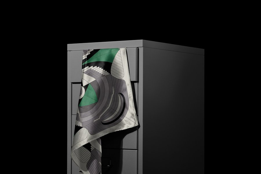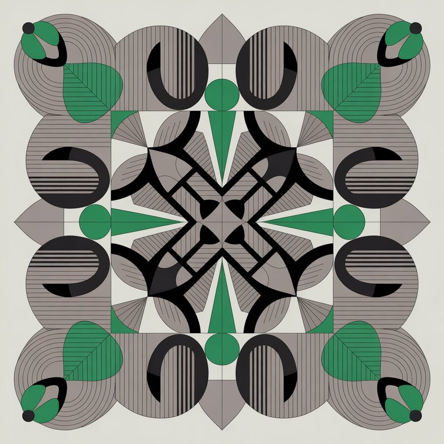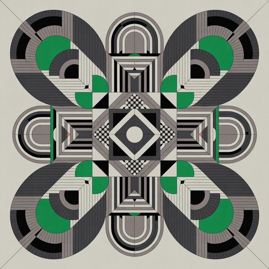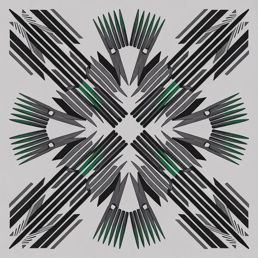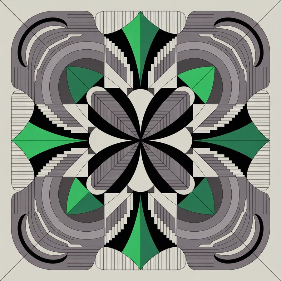 Create a powerful and intricate ornamental print for a 25×25 cm silk scarf. The design must blend the strict geometry and visual logic of Constructivism with the cyclical rhythm and runic repetition of Scandinavian ornamentation. Beneath the clean structure, let there pulse a primordial force — something ancient and wild, like the echo of ritual drums carved in stone. Integrate subtle references to archaic symbols: abstracted beasts, fractured totems, sharp fang-like forms, and vortex spirals that feel like prehistoric signals. Use a symmetrical and modular layout, with densely packed angular shapes — squares, rotated axes, sharp diagonals, and circular fragments that collide and interlock. Let there be a feeling of tectonic plates grinding together — a geometric earthquake frozen in time. Color palette: base tones of deep charcoal gray and black, with light gray to define forms and create depth; then unleash electric green as controlled chaos — streaks of unnatural life, pulsing like radioactive veins in a stone tablet. The final print should feel like an ancient war chant encoded in machine logic — architectural, mythic, threatening in its order. Think vector-art, high resolution, no gradients, pure shape and tension.