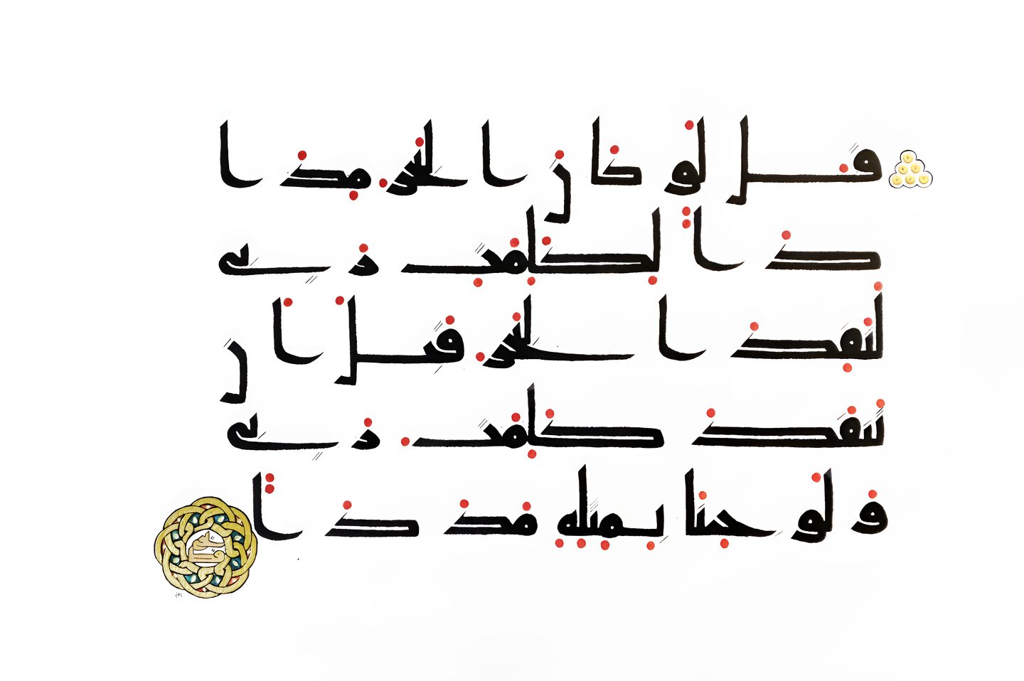 In terms of Kufi script, this means that today’s Arabic calligraphy masters study this ancient art form in detail, perfecting their skills over the years and following strict rules. This process involves the use of traditional materials and tools such as bamboo kalams, paper and ink, and mosaics for geometric kufi (bannai).