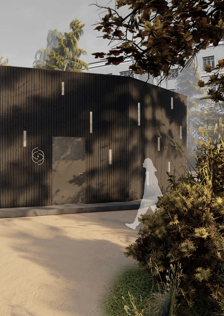 Форма павильона представляет собой многогранник из 12 граней, аналогично часам. Находясь внутри павильона мы не можем чётко видеть реальность вне помещения, мы находимся в «переливающемся коконе» благодаря матовому стеклу и стекающей по нему воде.