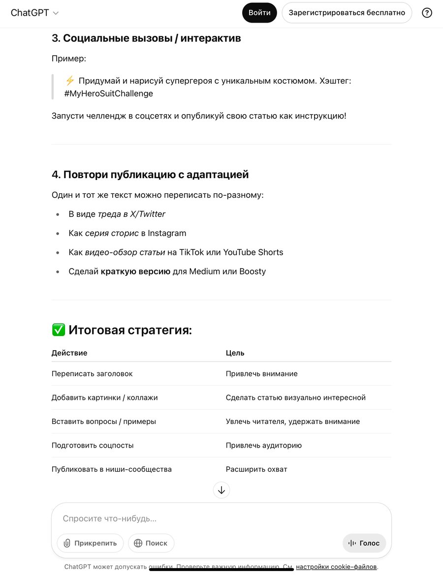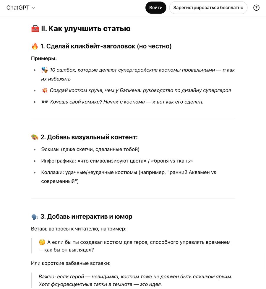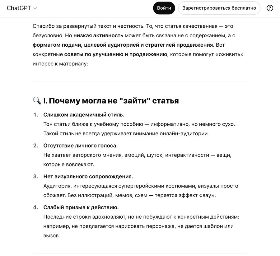 Так как создание и продвижение статьи с помощью ИИ не показало хороших результатов и особо не подняло активности в блоге, я отправила статью ChatGPT для анализа ошибок. Я получила следующие советы по улучшению статьи: