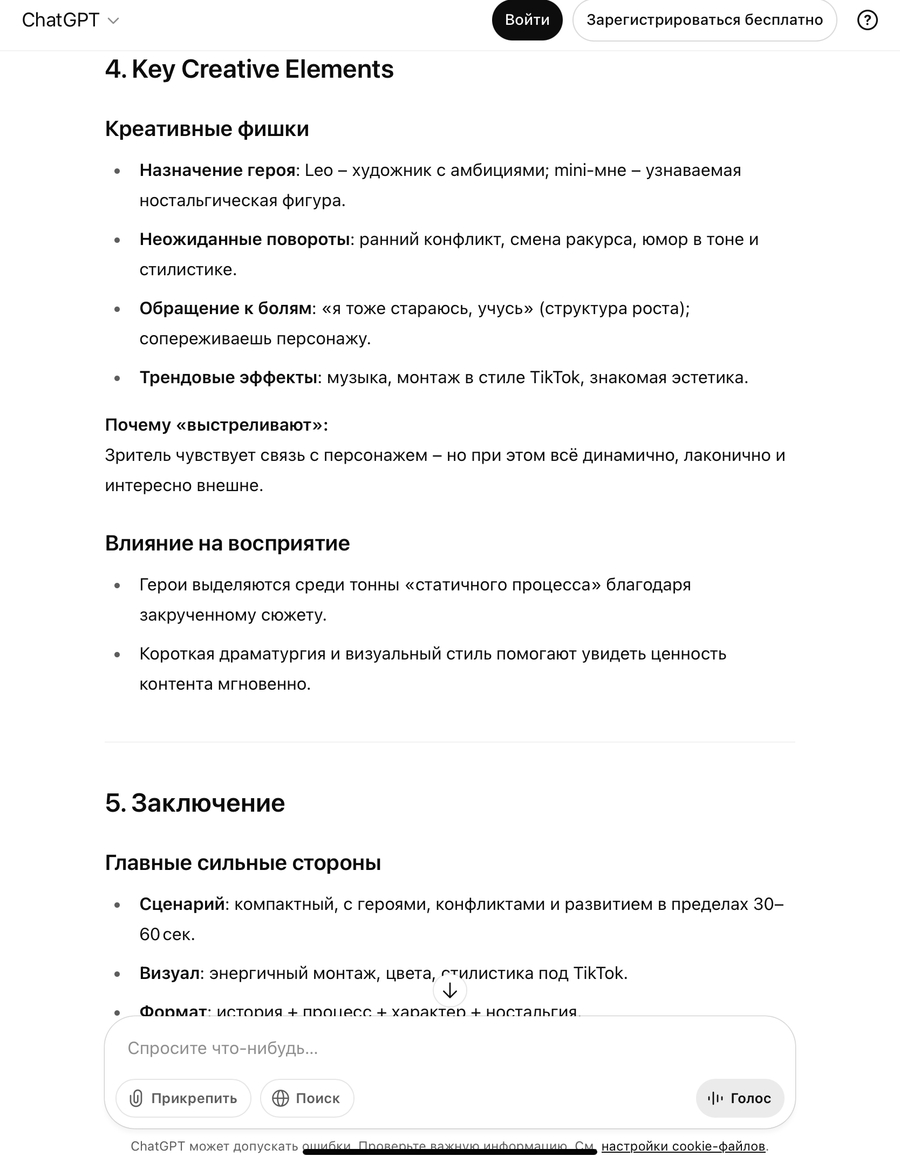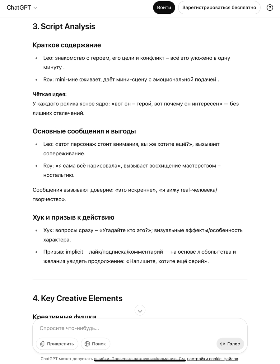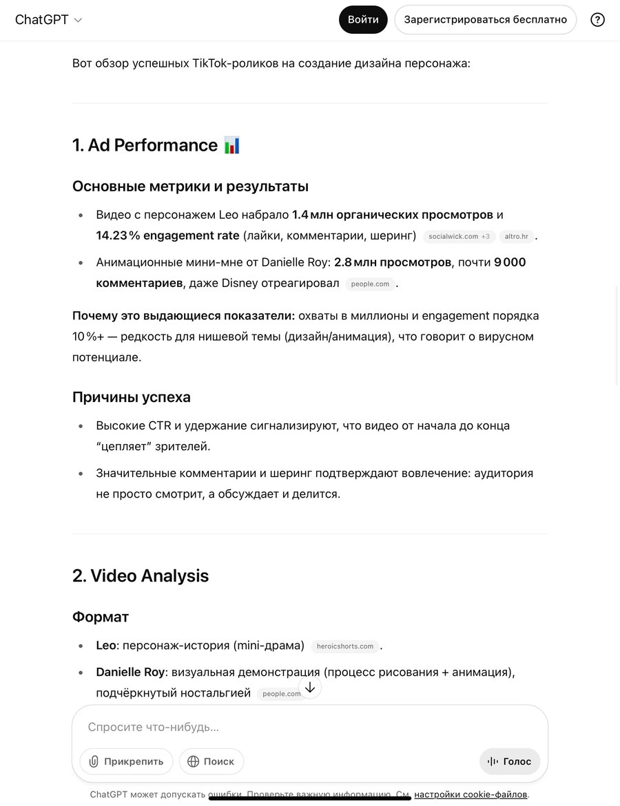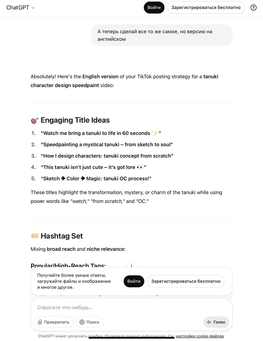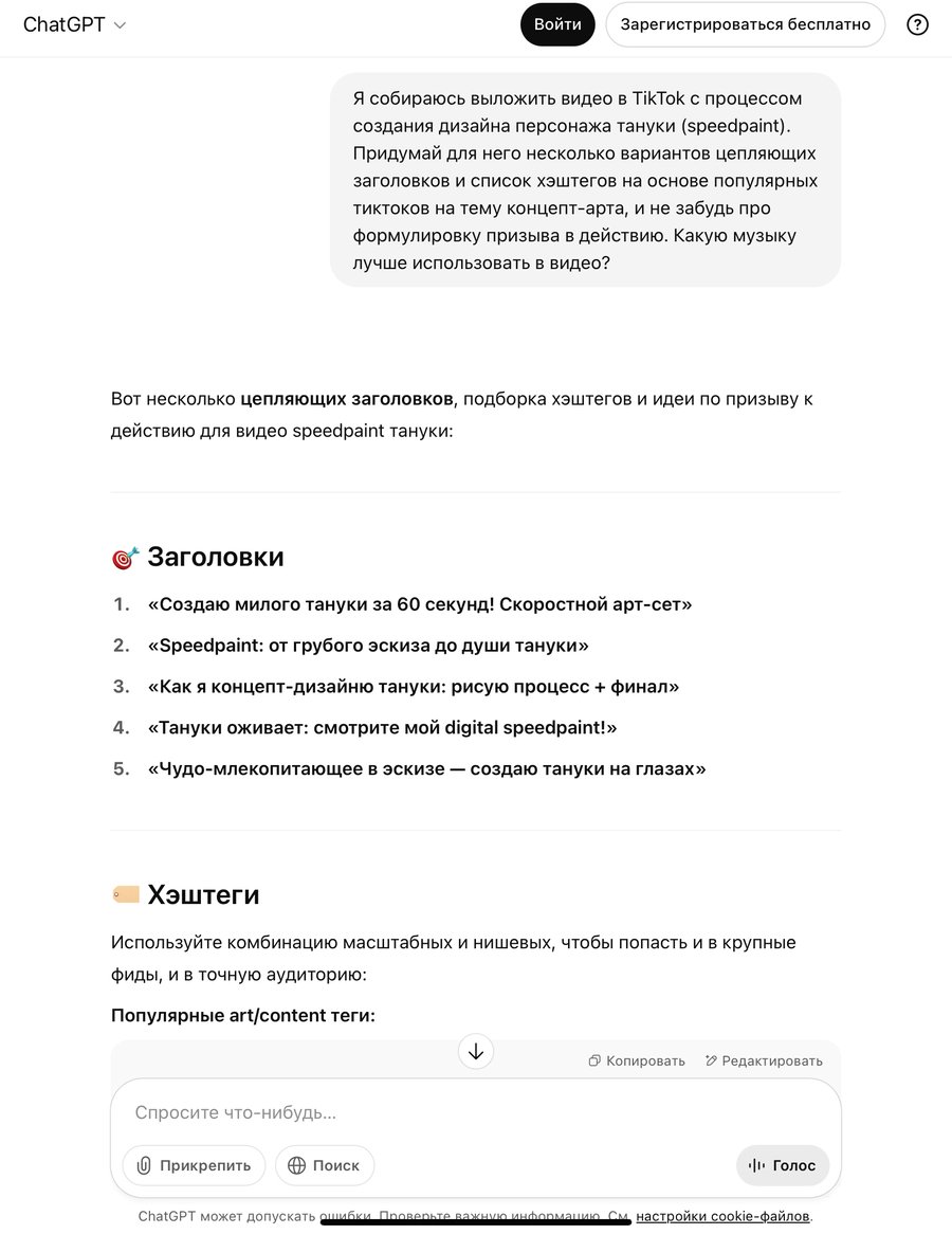 Я проанализировала при поддержке ChatGPT популярные видео из раздела концепт-арта и дизайна персонажей и пришла к выводу, что людям интересно смотреть на процесс создания арта/дизайна; что в продвижении помогает использование популярного трека; а еще что люди активно поглощают контент с милыми животными — поэтому я выложила таймлапс своих поисков дизайна персонажа и благодаря ChatGPT сформулировала заголовок и список хэштегов.