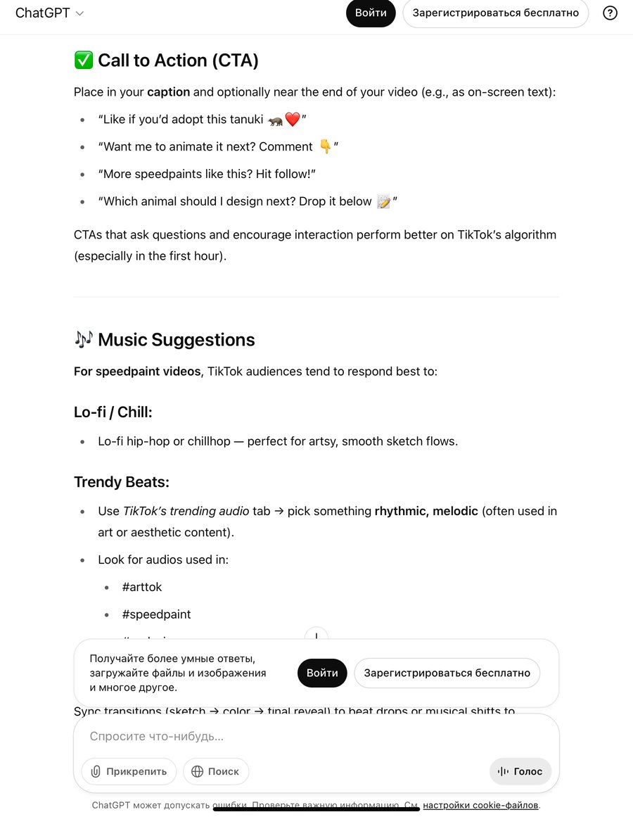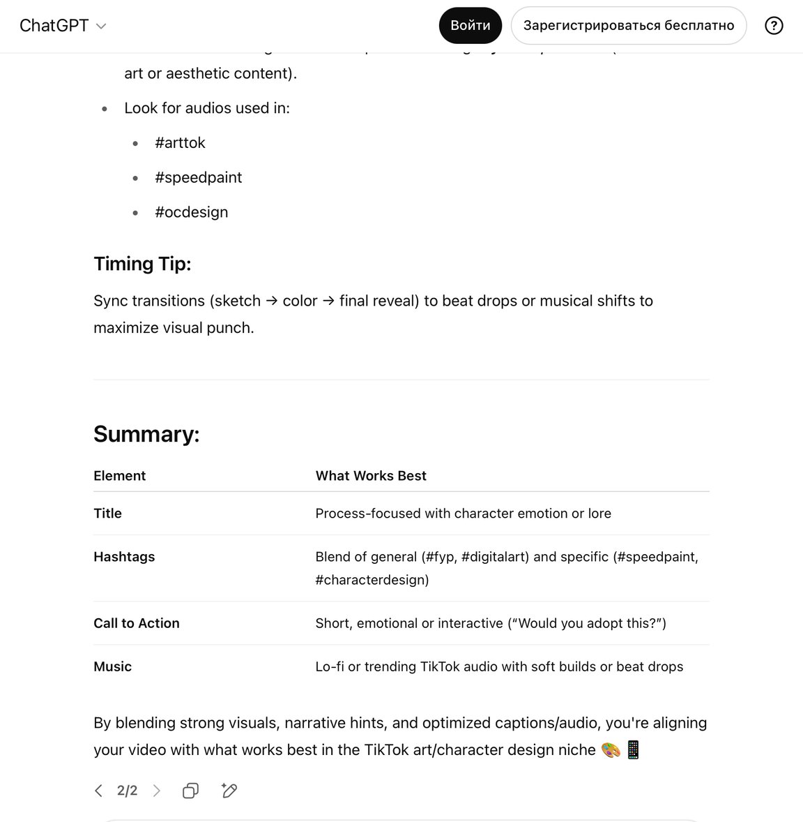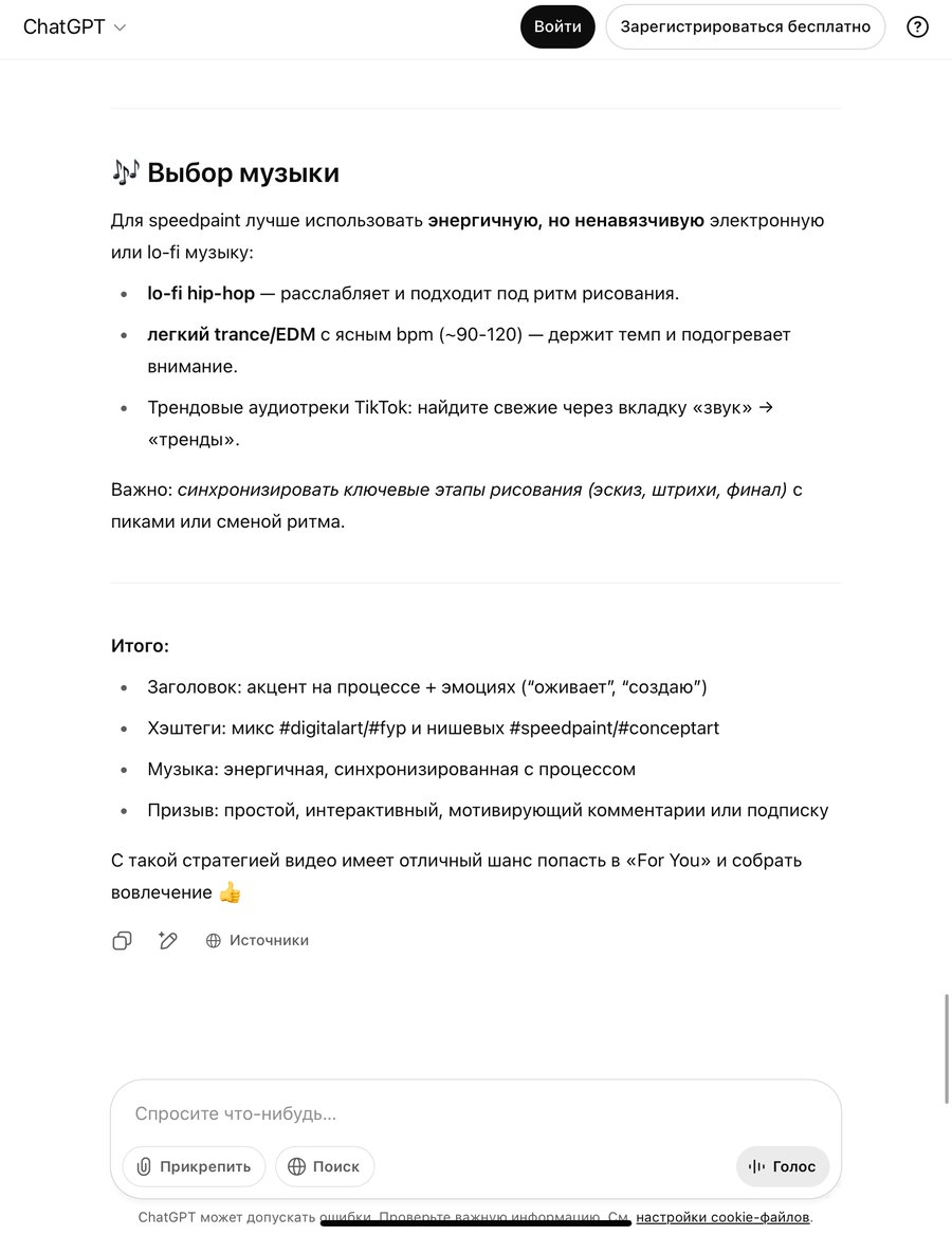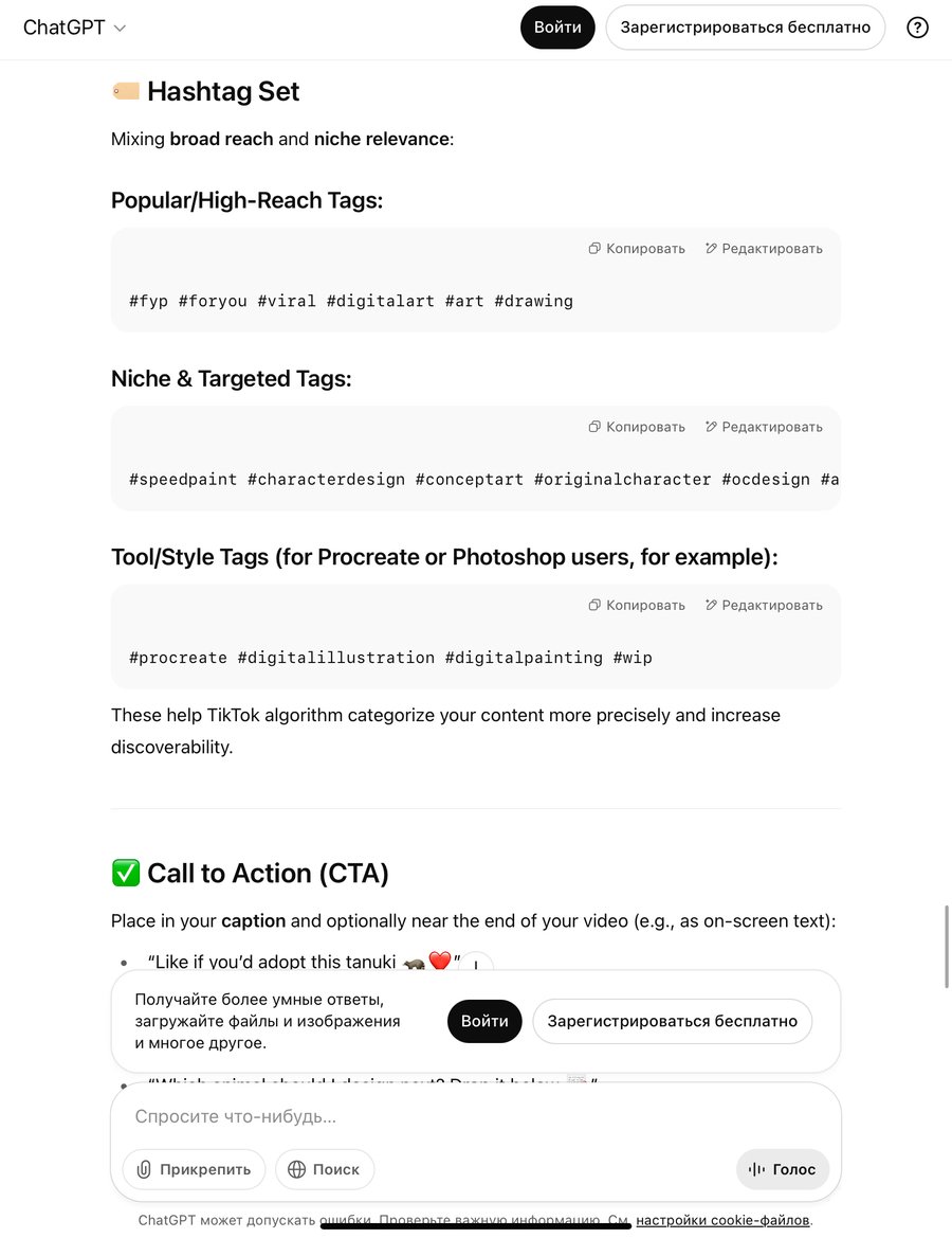Во втором ДЗ нужно было использовать инструменты ИИ для создания и публикации видео-материала. В этот раз я решила не использовать ИИ для генерации самого контента, а лишь попросить его проанализировать популярные публикации, а также сгенерировать заголовок и хэштеги. В итоге я выложила в TikTok спидпеинт своего процесса создания оригинального персонажа.
