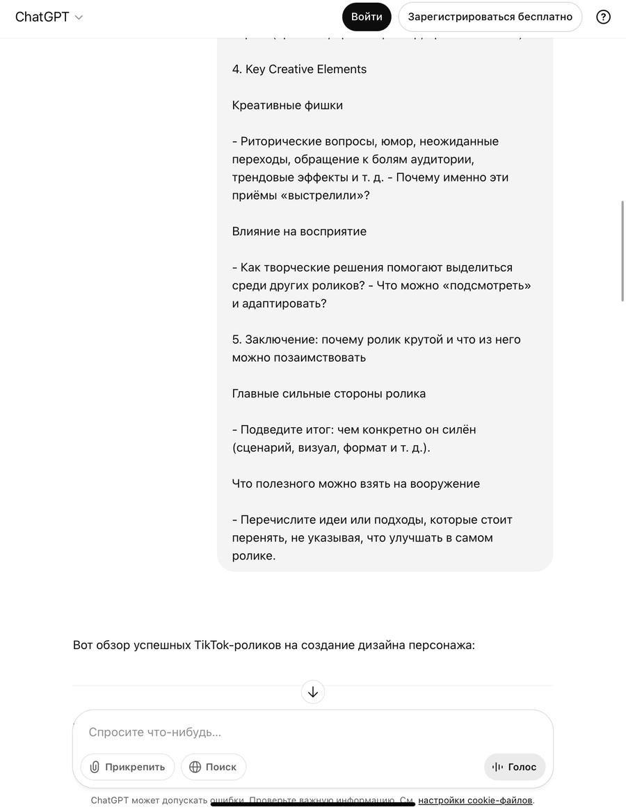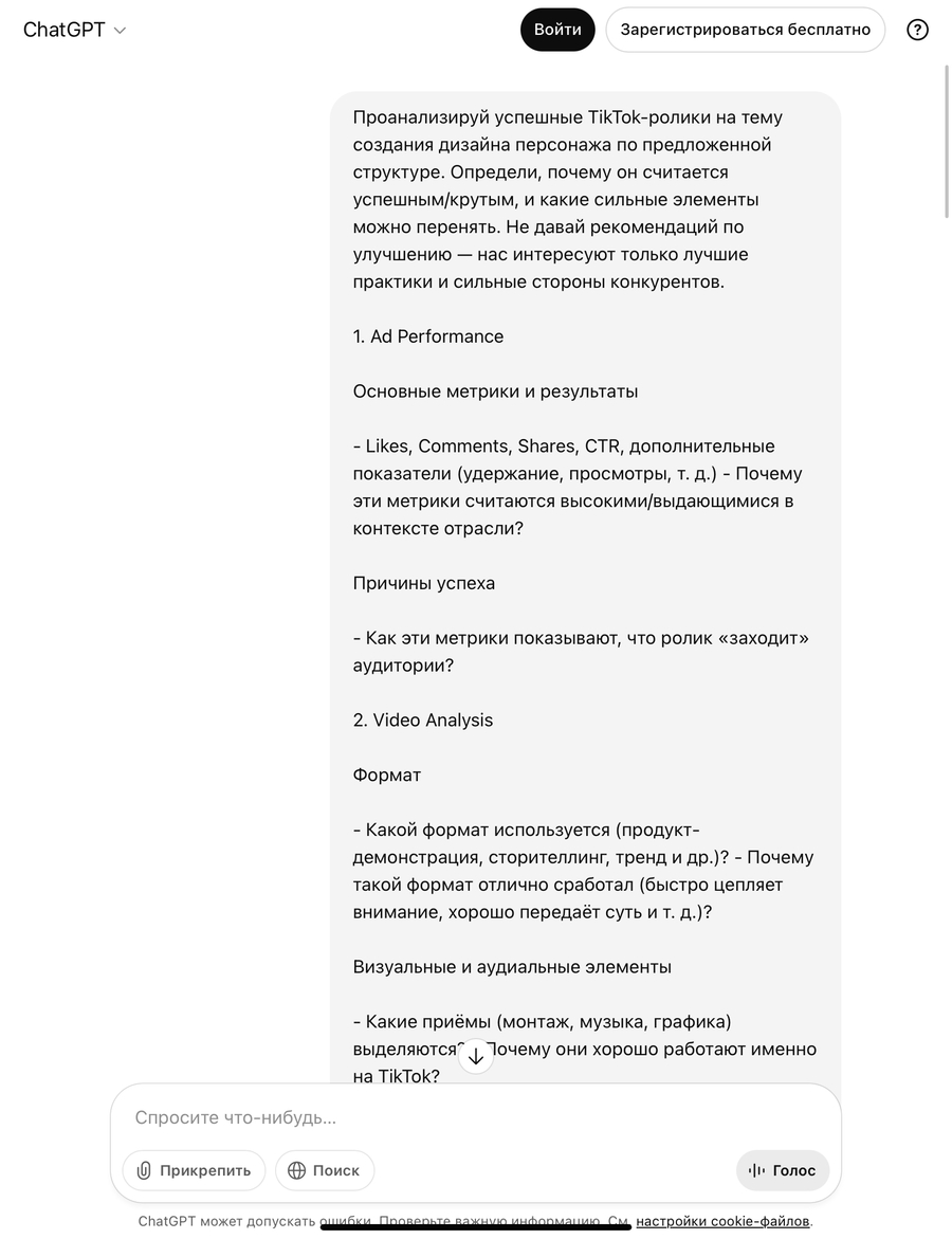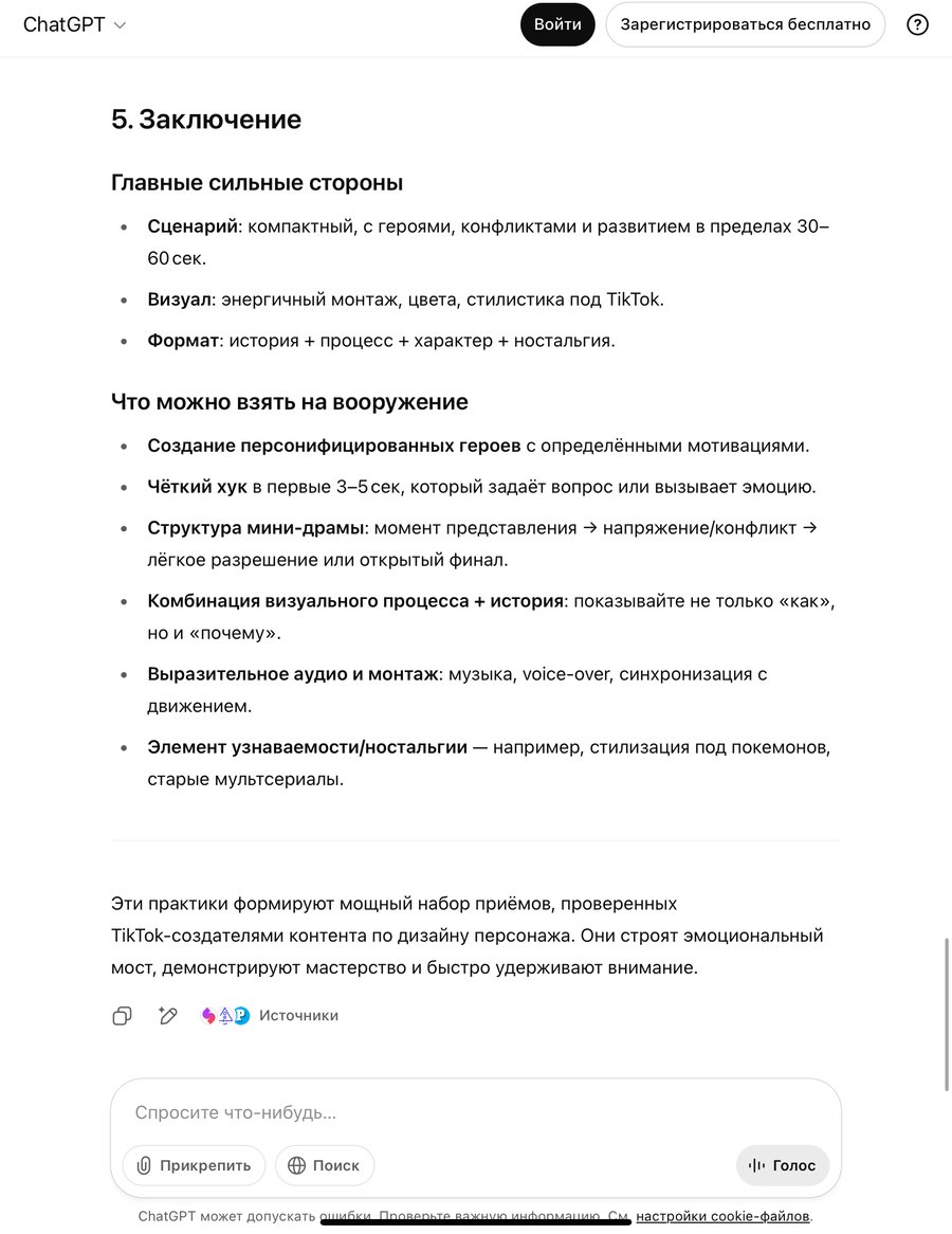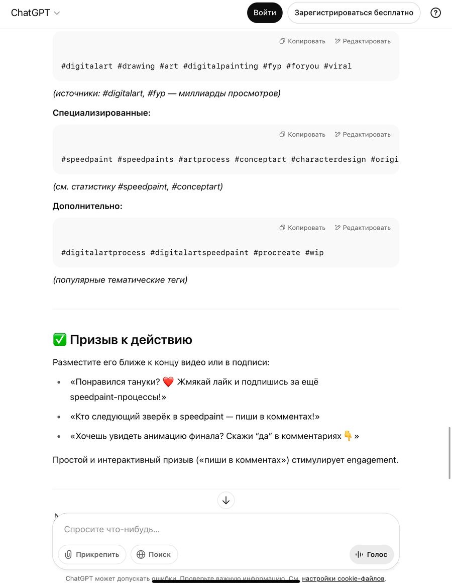 Во втором ДЗ нужно было использовать инструменты ИИ для создания и публикации видео-материала. В этот раз я решила не использовать ИИ для генерации самого контента, а лишь попросить его проанализировать популярные публикации, а также сгенерировать заголовок и хэштеги. В итоге я выложила в TikTok спидпеинт своего процесса создания оригинального персонажа.