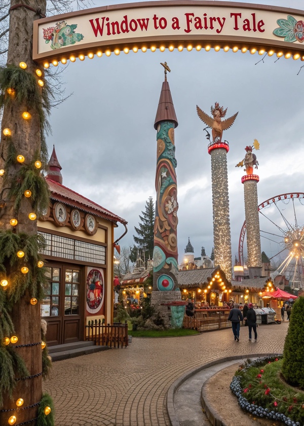 Промпт: Create a realistic photo of the Amusement park «Window to a Fairy Tale» with themes of Slavic mythology and Slavic fairy tales