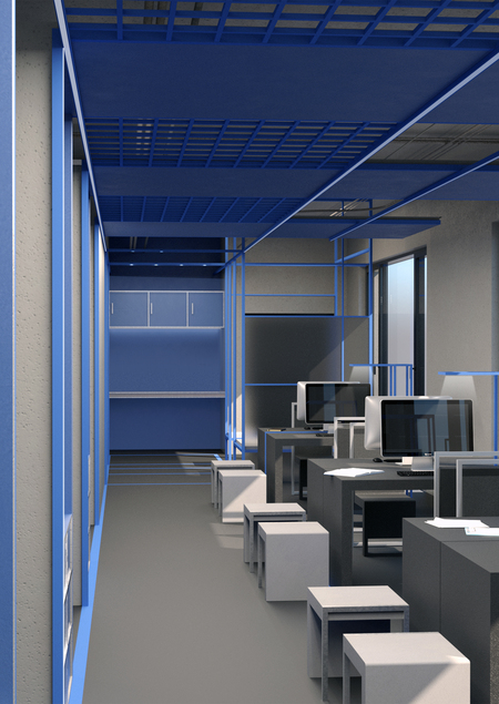 Учебный офис объединяет протяженный пространство, ведущее к зоне отдыха, которая, по аналогии с водонапорной башней Канатного цеха, имеет легкую акцентную и видимую насквозь структуру из труб. Похожую композицию имеет учебный класс, в котором акцентные конструкции направляют внимание к месту преподавателя.