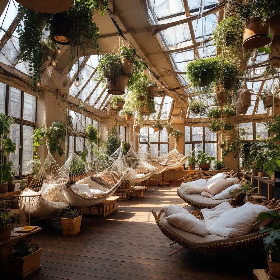 Помещение бренда — небольшая оранжерея в центре города, где есть много растений, висят гамаки и слышны звуки природы, так что человек здесь может почувствовать спокойствие.