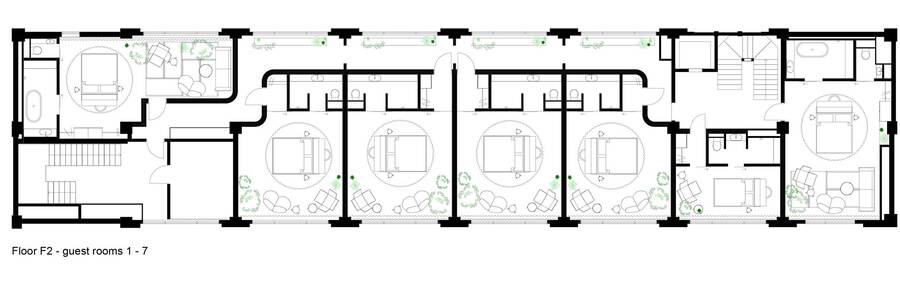 Двадцать отдельных и общих номеров дают возможность встречаться с другими и делить пространство (без неуютной атмосферы хостела) или сохранять конфиденциальность — цель отеля — «объединить людей, которые любят еду, дизайн, искусство и культуру», для отличного времяпрепровождения и хорошего ночного сна.