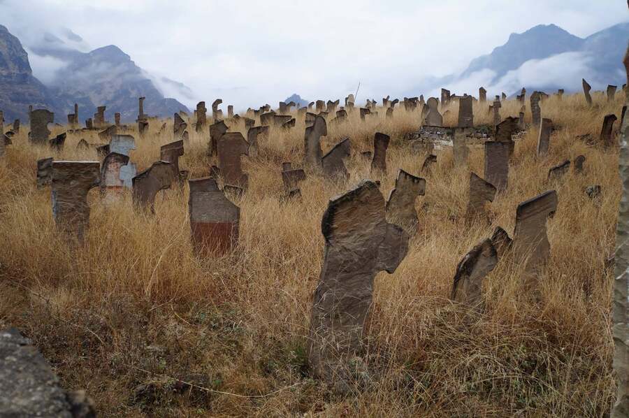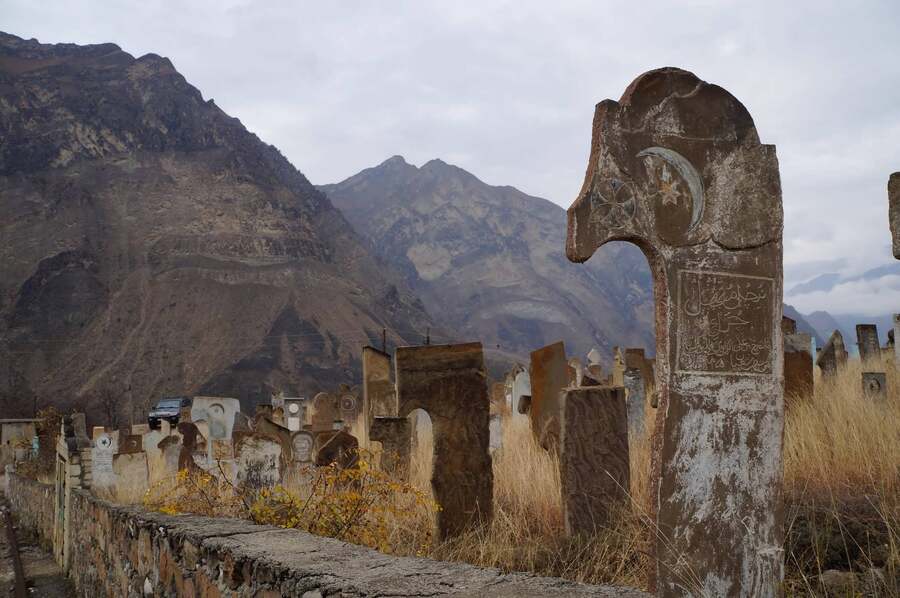 Надгробия на кладбище в селе Гимры выполнены в виде шашек, которые воткнуты в землю. Это одно из немногих подобных кладбищ в Дагестане.