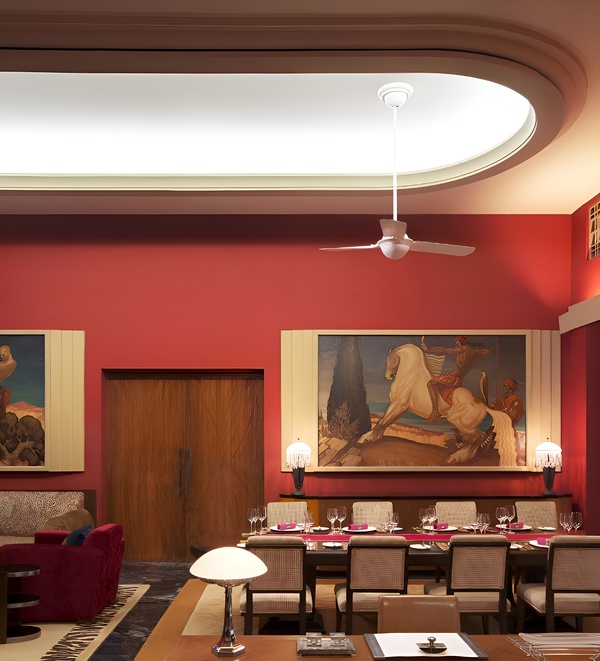 По всему периметру гостиницы можно увидеть предметы искусства. Основная цветовая палитра гостиницы состоит из коричневого, нежно-желтого и изумрудного цветов. Темные старинные алтарные шкафы контрастируют с яркими креслами из ротанга и подушками с принтом ар-деко, как раз и создают ощущение фьюжна.