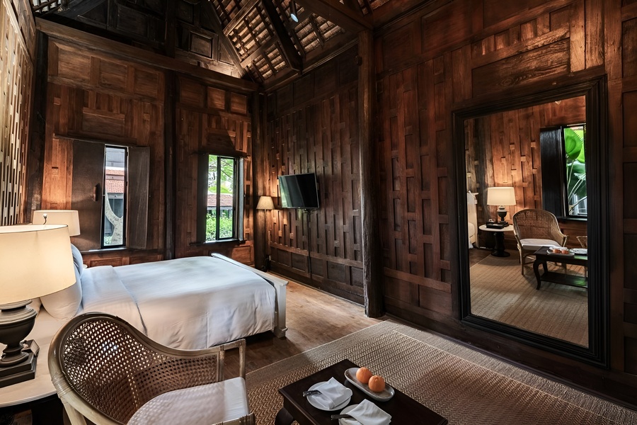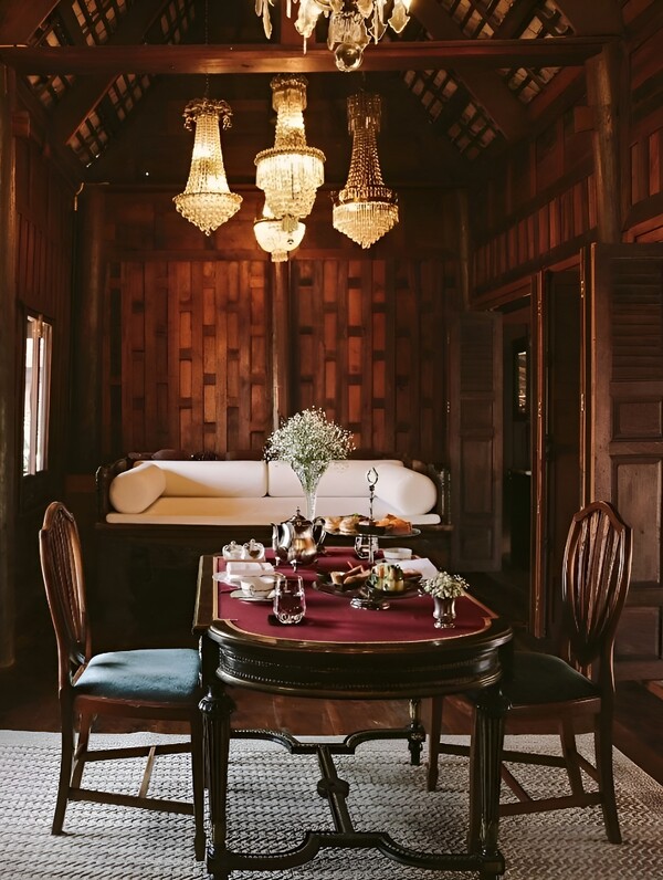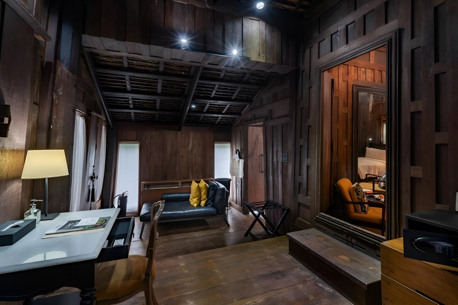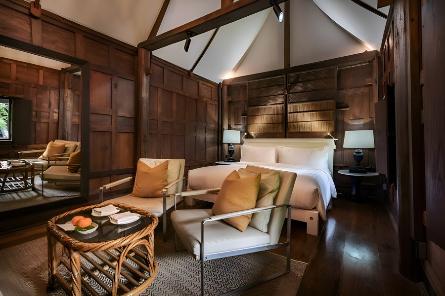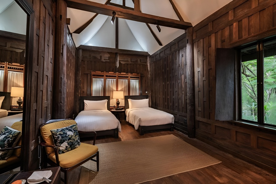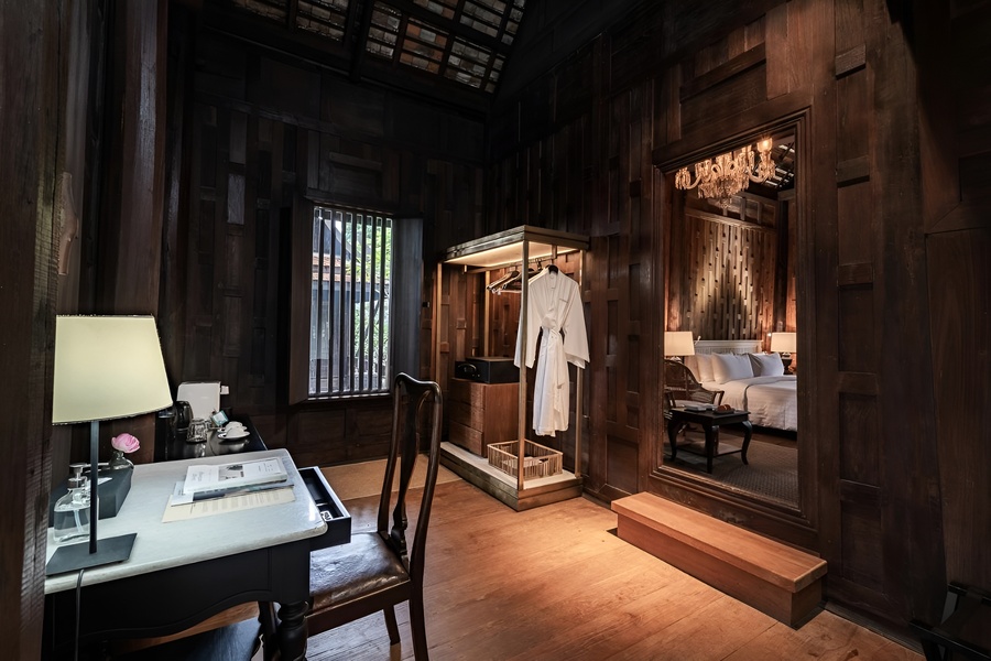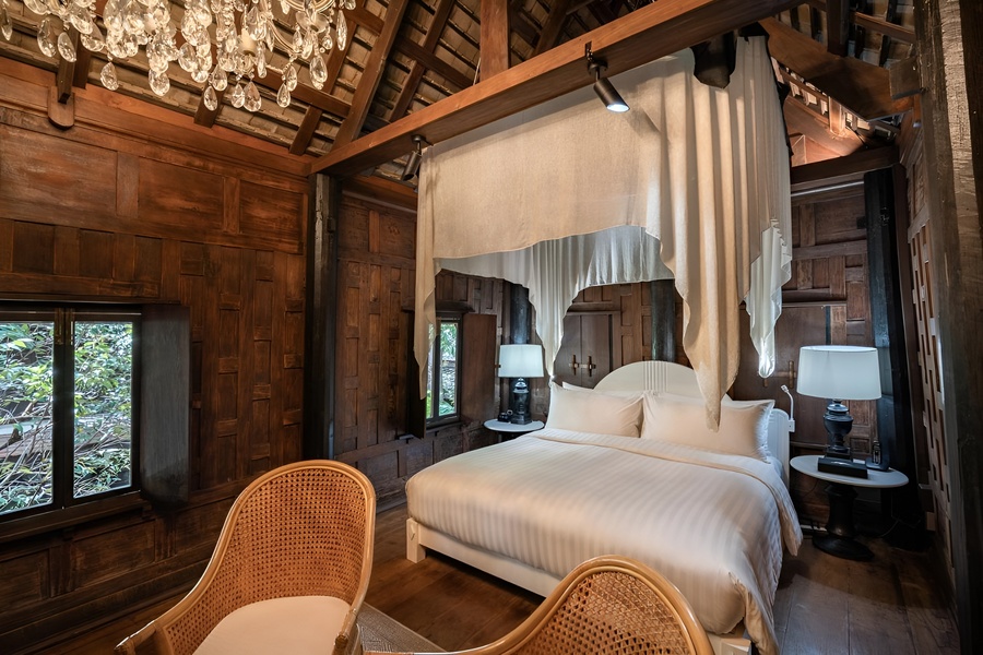 Интерьер выполнен в тайском стиле с добавлением антиквариата и современного фьюжна. Темный цвет тикового дерева осветляют гобелены с яркими принтами, белоснежное постельное белье, стеклянные люстры и акцентные цветовые элементы.