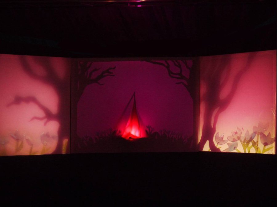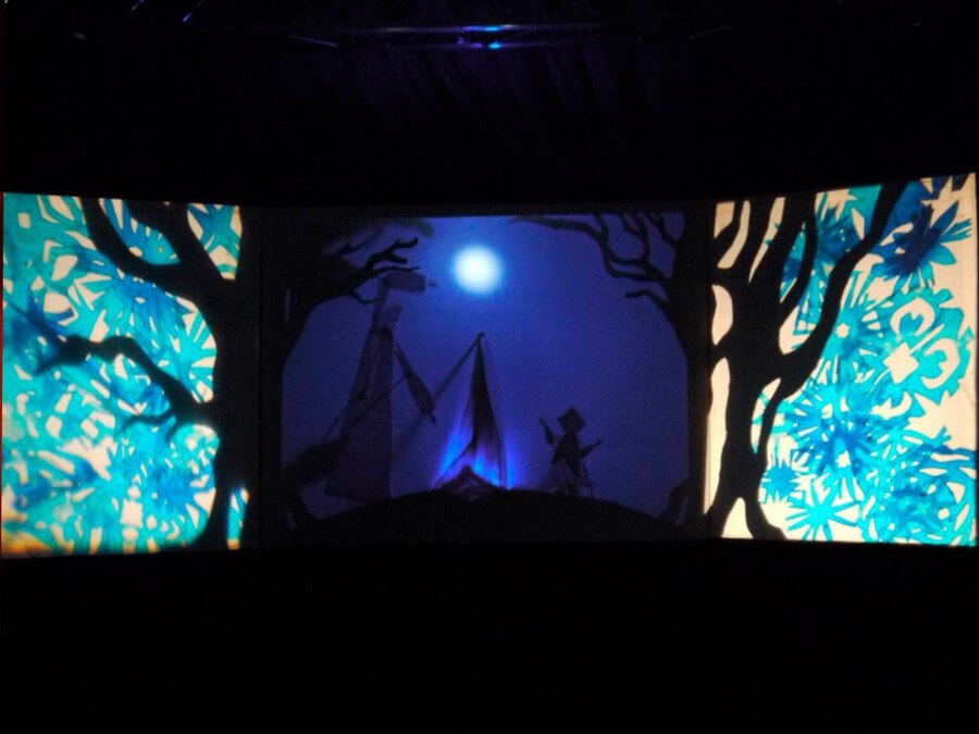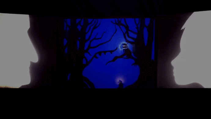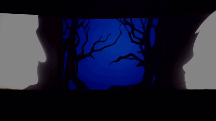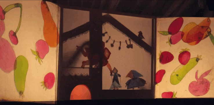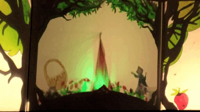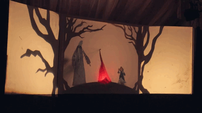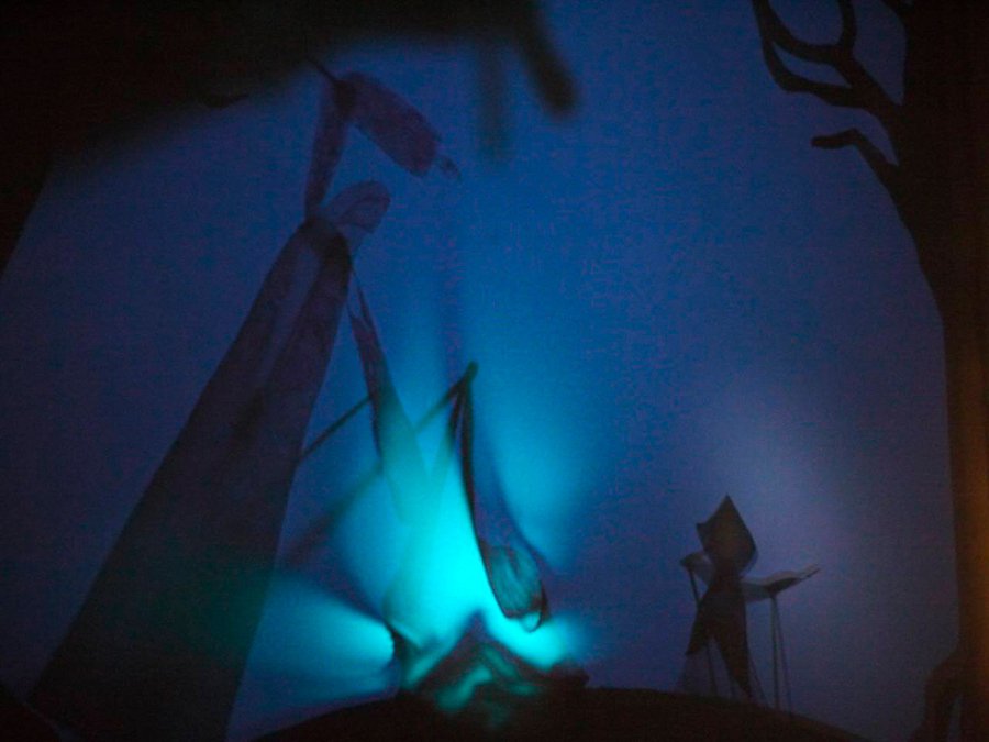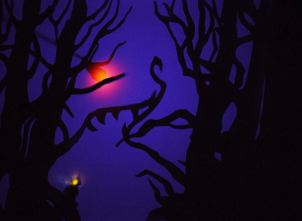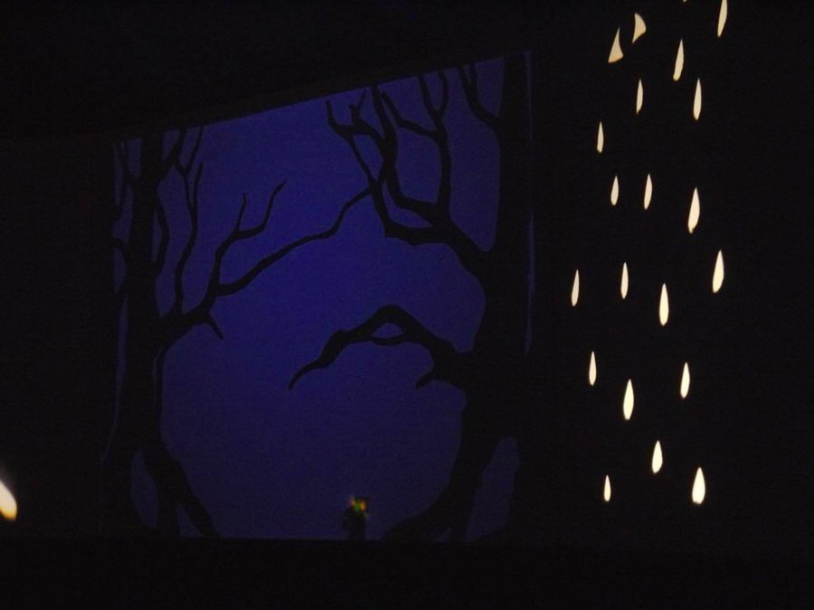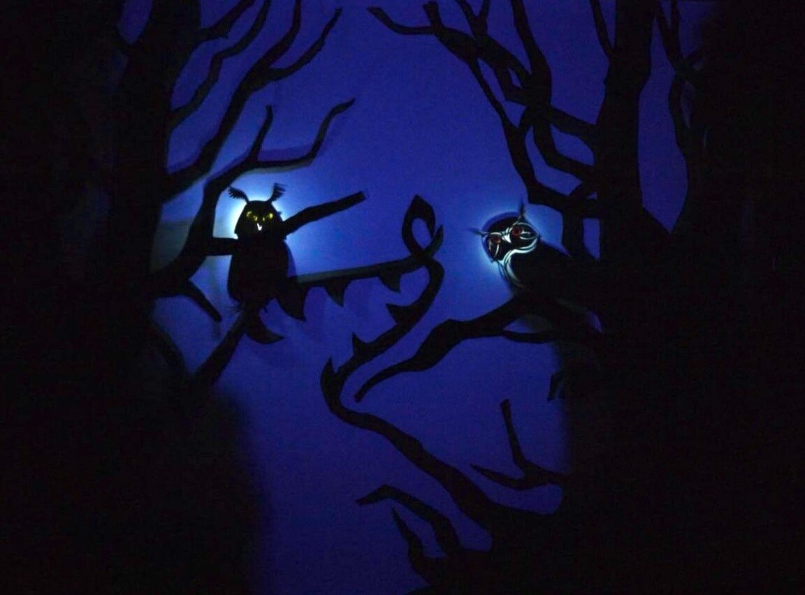 Три раза Марушка ходит в лес и с каждым разом он становится все страшнее — всё в этой жизни ей достается с трудом. А вот для мачехи и Олены лес исчезает, для них жизнь легка. Для контраста со страшным лесом мы уменьшили фигуру Марушки и подсветили ее фонариком. Мы старались, чтобы с каждым разом лес становился страшнее: в нём появляются филины, ветки шевелятся и стараются схватить Марушку, к концу пьесы тьма леса заполоняет весь экран. А перед мачехой и Оленой лес расступается сам собой.