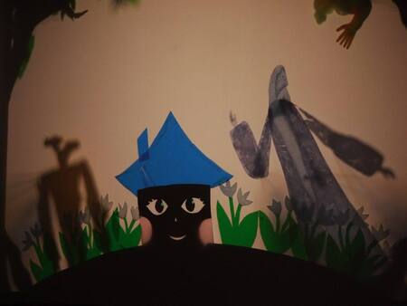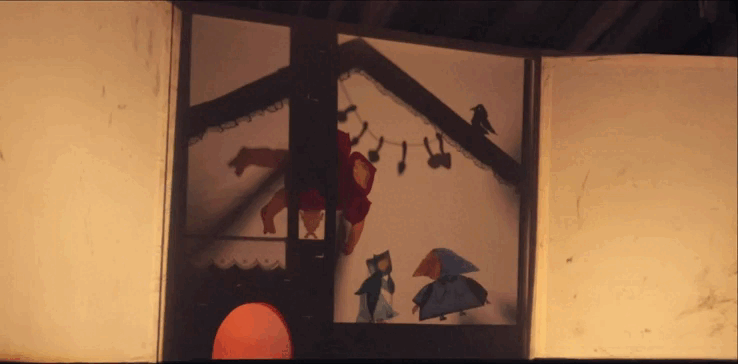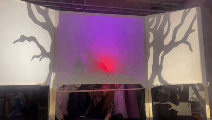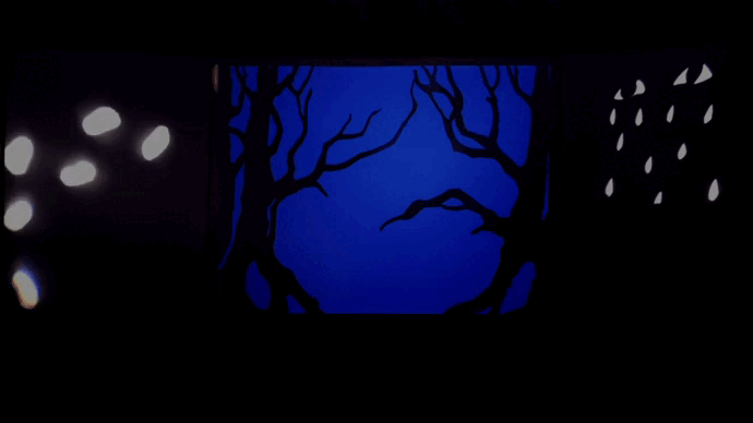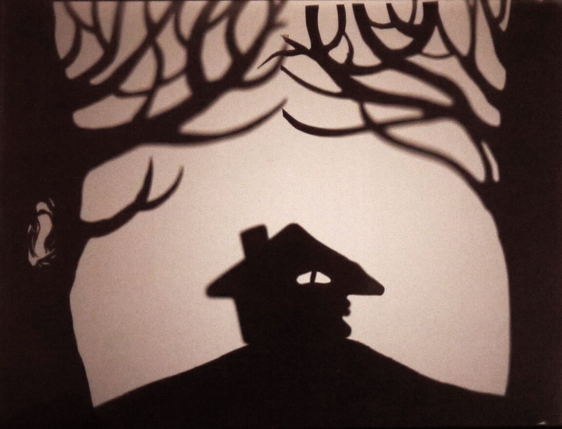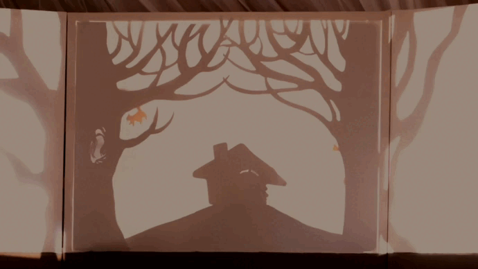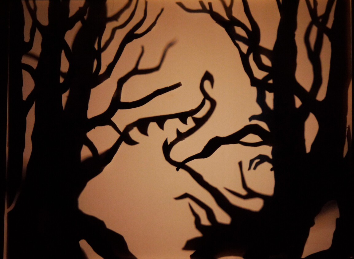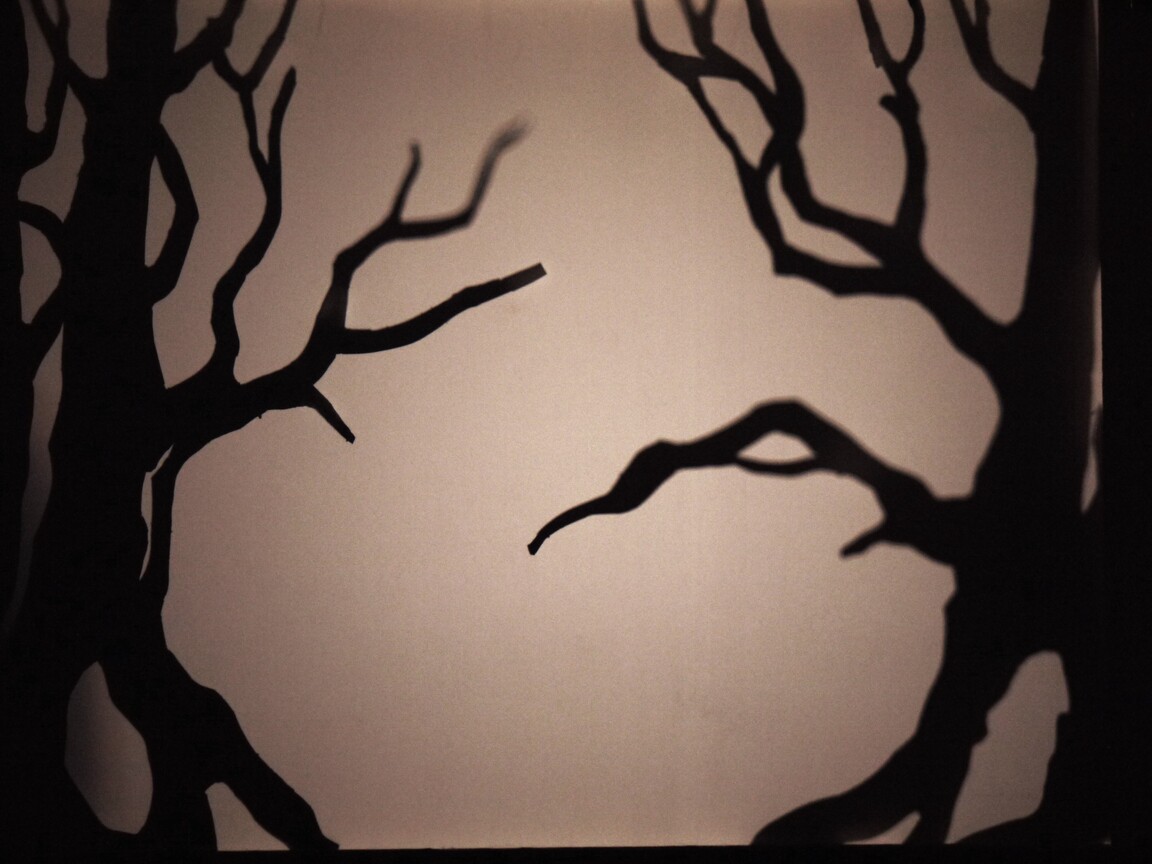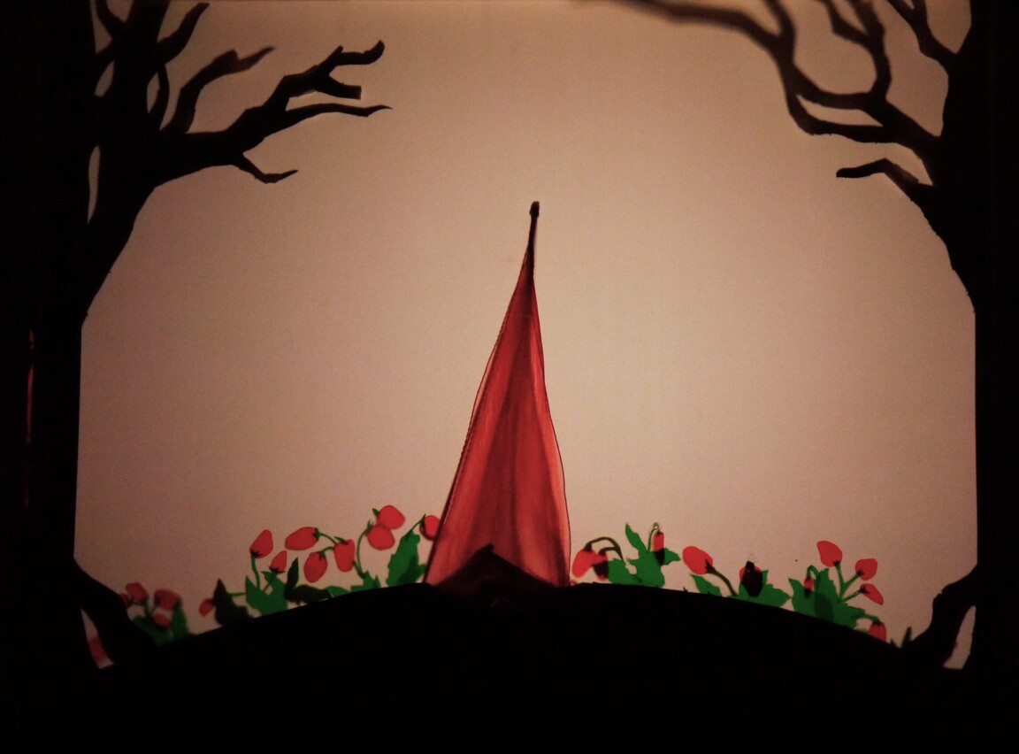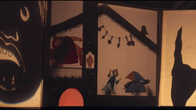 Три раза Марушка ходит в лес и с каждым разом он становится все страшнее — всё в этой жизни ей достается с трудом. А вот для мачехи и Олены лес исчезает, для них жизнь легка. Для контраста со страшным лесом мы уменьшили фигуру Марушки и подсветили ее фонариком. Мы старались, чтобы с каждым разом лес становился страшнее: в нём появляются филины, ветки шевелятся и стараются схватить Марушку, к концу пьесы тьма леса заполоняет весь экран. А перед мачехой и Оленой лес расступается сам собой.