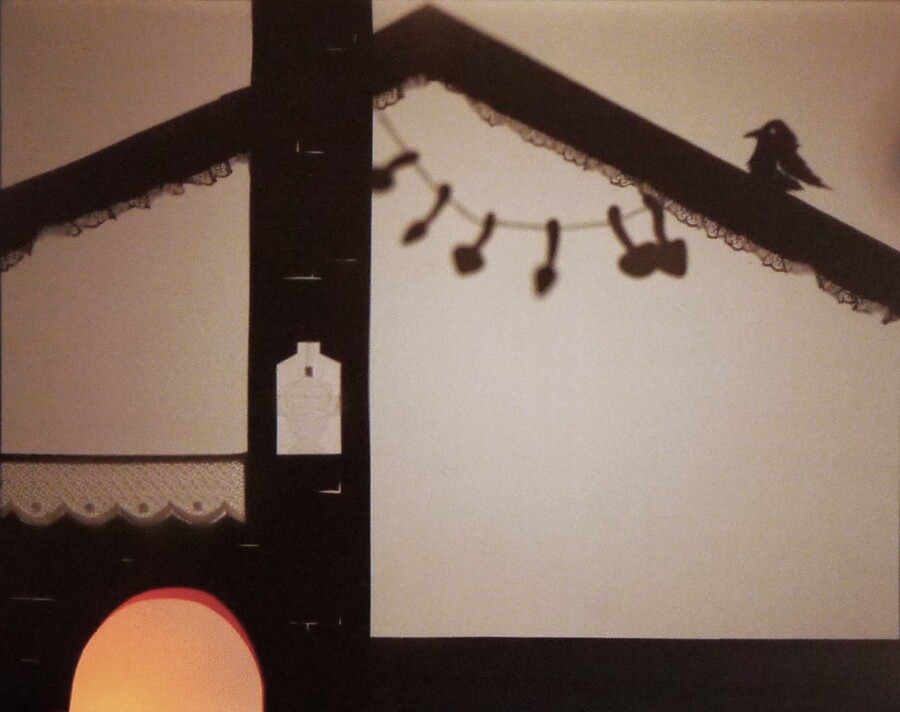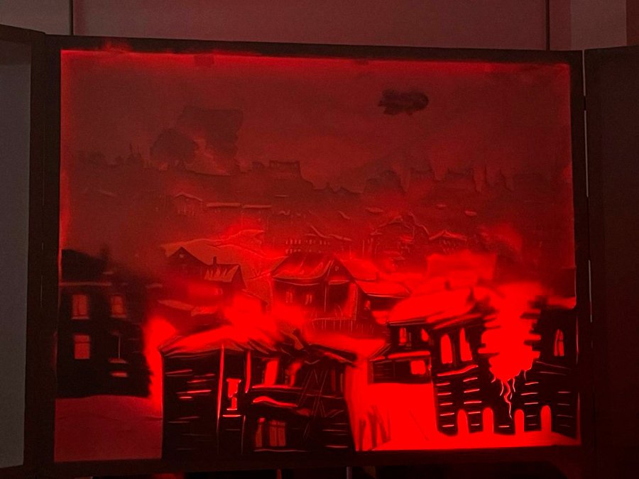 Решили выполнить сцену как триптих: центральная часть — главная, самая большая, и две боковых, на которых изображается комментарий или дополнение к основному действию. На центральную часть действие проецировалось из-за экрана. Для изображения на боковых створках мы использовали кодоскопы.