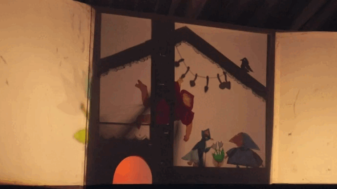 Родной дом неприветлив для Марушки: мы воплощаем это в образе дома-мачехи, который пинает девочку по бесконечным поручениям. Зеркально, в конце сказки появляется цветущий дом-Марушка.