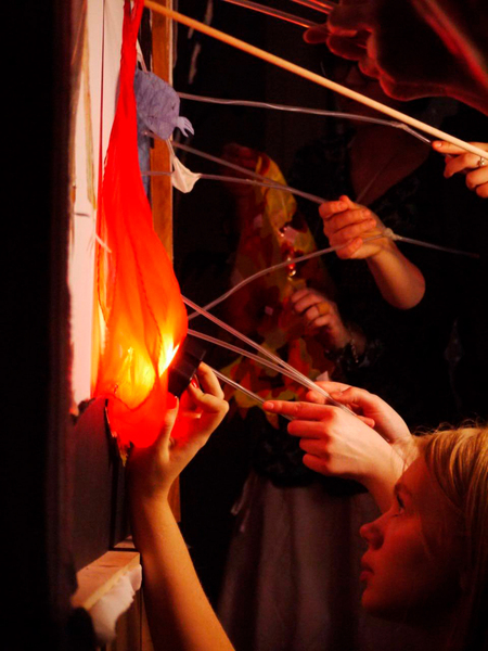 Костер — первый герой поляны, с которым мы знакомим зрителя. В нашей сказке он обретает жизнь благодаря отдельному актеру, который приводит в движение пламя, и оно танцует вместе с Марушкой и пригибается когда над ним пролетают ягоды. Как костёр, оживает и корзинка Маршуки, прыгая по всей сцене.
