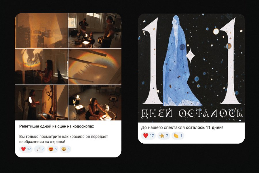 Команда дизайнеров создавала афиши и брошюры, занималась рекламой. В течении всего времени создания спектакля, команда вела телеграм-канал, в котором постепенно знакомила зрителей с предстоящим ивентом, а также приоткрывала завесу закулисья.