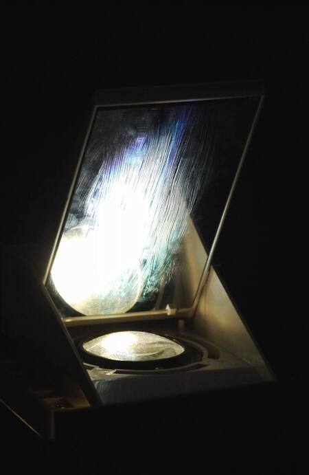 Кодоскоп — оптический прибор, предназначенный для проекции прозрачных оригиналов с изображением на большой экран. Кодоскоп стоял перед сценой.