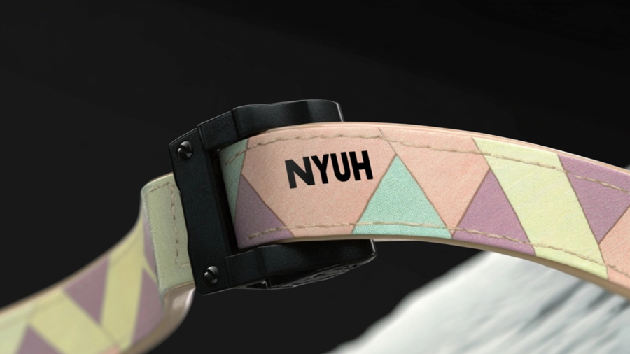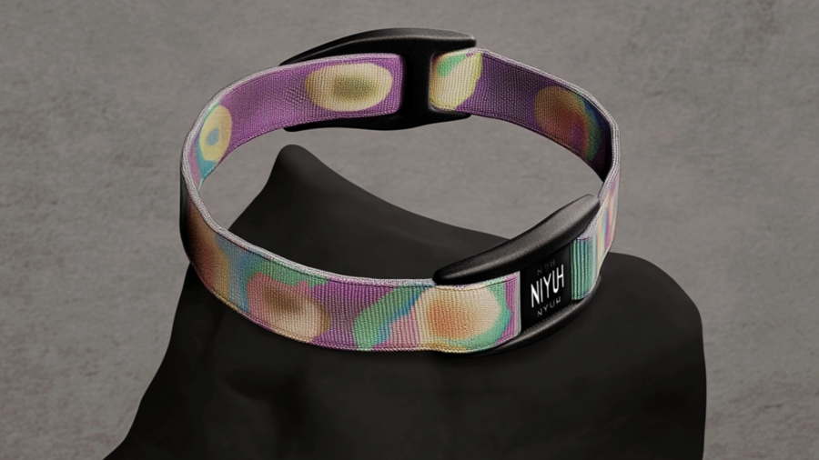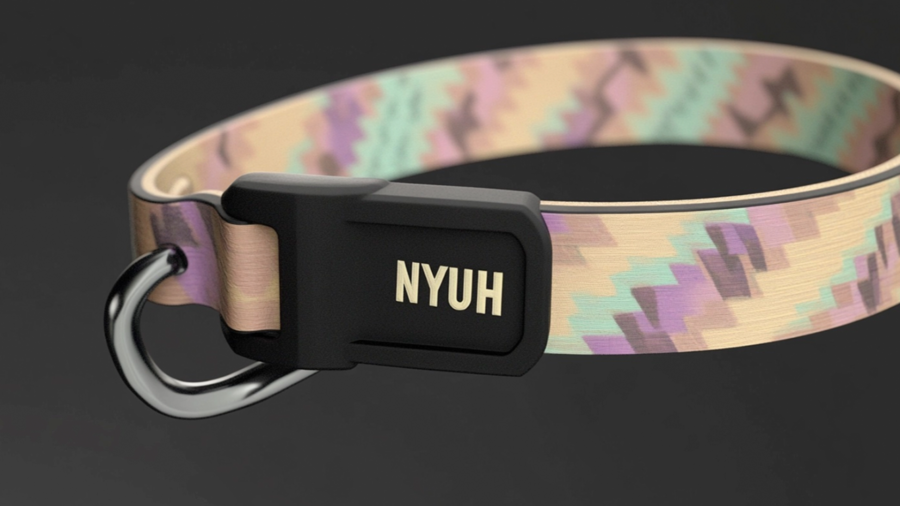 Промт: Realistic style render, create a collar for a dog on a solid black background. collar for a dog with an unusual abstract pattern in pastel colors, with «NYUH» embroidery, beautiful rendering in good lighting
