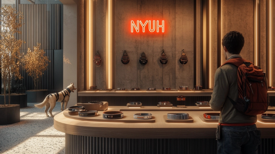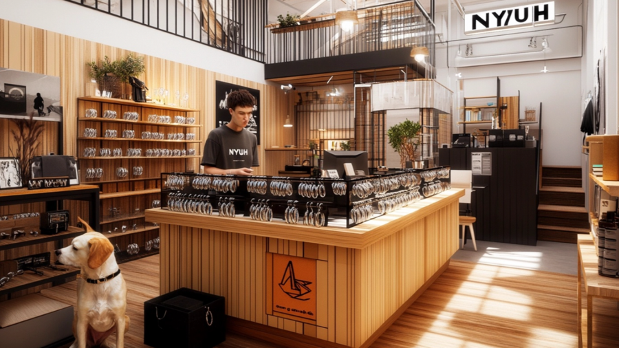 Промт: generate a photorealistic image of a counter that sells stylish dog collars, a wooden stand, with beautiful chrome price tags, a neon «NYUH» sign hanging on the wall, a daring design, a young guy with a dog looking at the collars, beige and gray color scheme, a warm, cheerful atmosphere