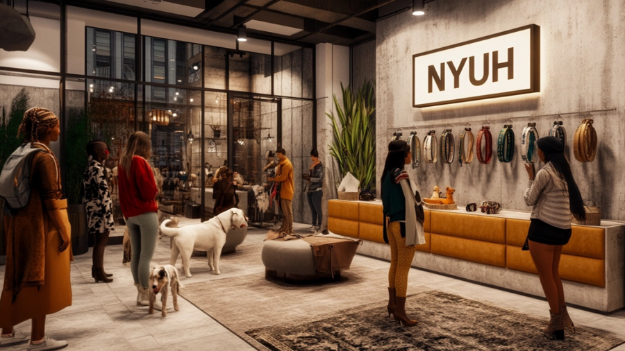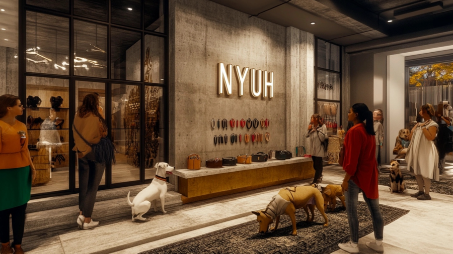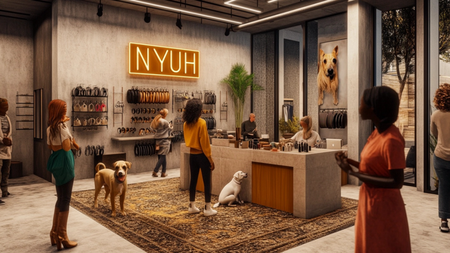 Промт: generate a photorealistic image of a stylish small store that sells dog collars, concrete walls, a neon «NYUH» sign hanging on the wall, dog collars behind the windows, many customers with dogs, bright lighting, beige and gray color scheme, fun and calm atmosphere