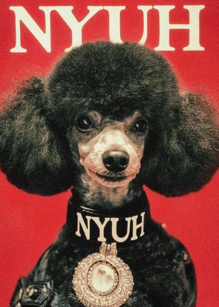 Промт: make an advertising poster with a picture of a poodle in a collar with the inscription «NYUH», red background, retro photo, photo taken on a film camera, fashion photo, on the top of the photo there is the inscription «NYUH»