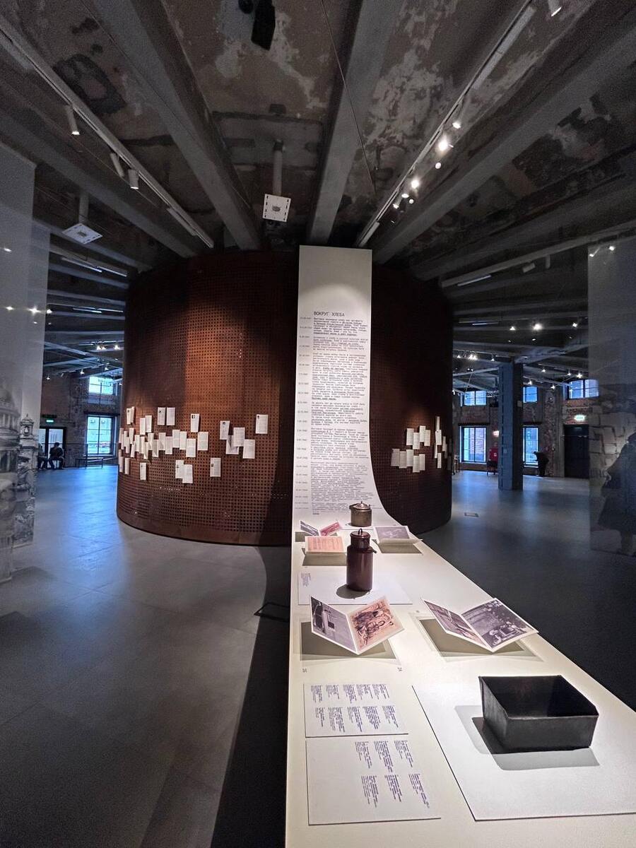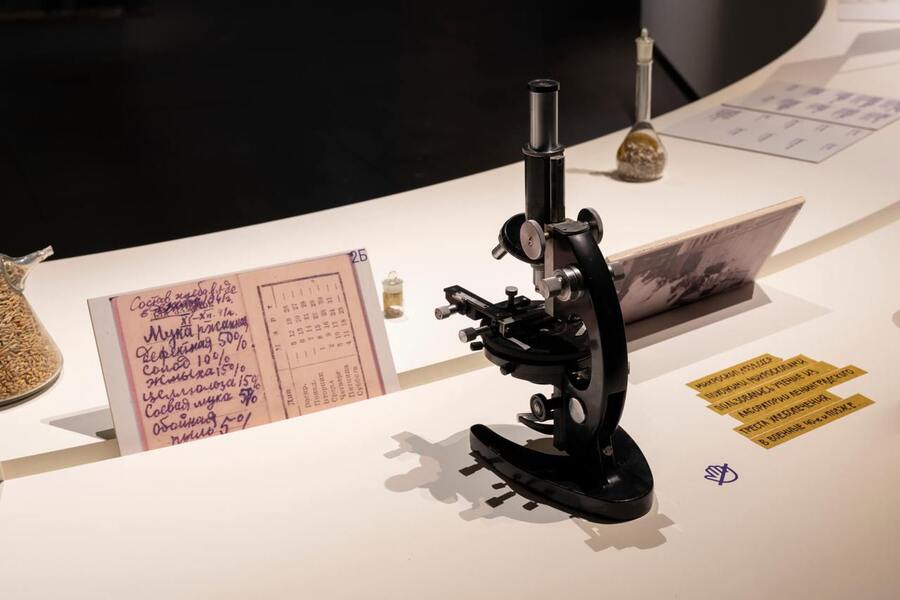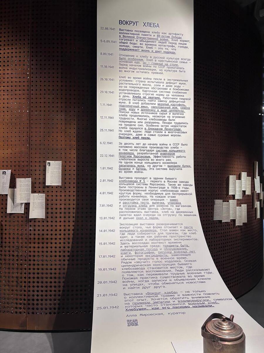 Выставка занимает часть первого этажа Центра, где ранее хлеб на деревянных палетах ждал отгрузки. Центральным элементом экспозиции является стол, форма которого отсылает к кольцевому конвейеру и одновременно напоминает место семейной трапезы и лабораторную поверхность. Экспозиция включает: истории людей, чьи судьбы были связаны с хлебом во времена Великой Отечественной войны, предметы быта того времени, лабораторную посуду и оборудование, а также книги, фотографии, рисунки и ингредиенты, заменившие обычные продукты в военное время, такие как картофель, семена трав, кора и целлюлоза.