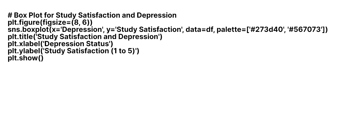 На этом коробчатом графике исследуется взаимосвязь между удовлетворенностью учащихся учебой и депрессией. Оно показывает, связано ли недовольство исследованиями с более высоким уровнем депрессии.