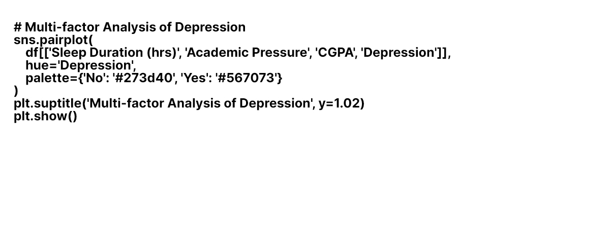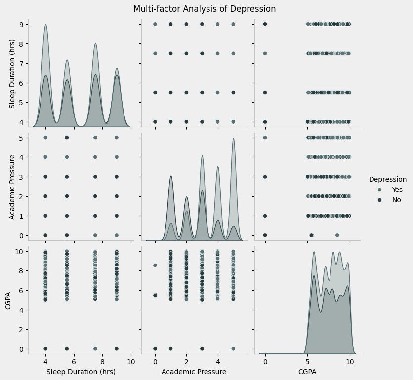 Этот парный график визуализирует взаимосвязь между несколькими факторами (продолжительность сна, академическое давление, CGPA) и статусом депрессии. Это помогает понять, как различные факторы одновременно способствуют депрессии.